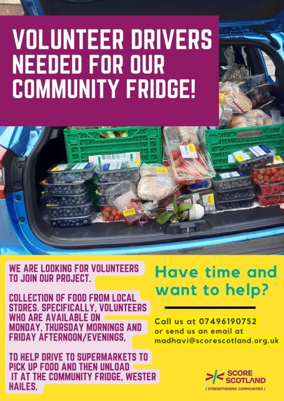 SCOREscotland are looking for people interested in being volunteer drivers to support their Community Fridge.