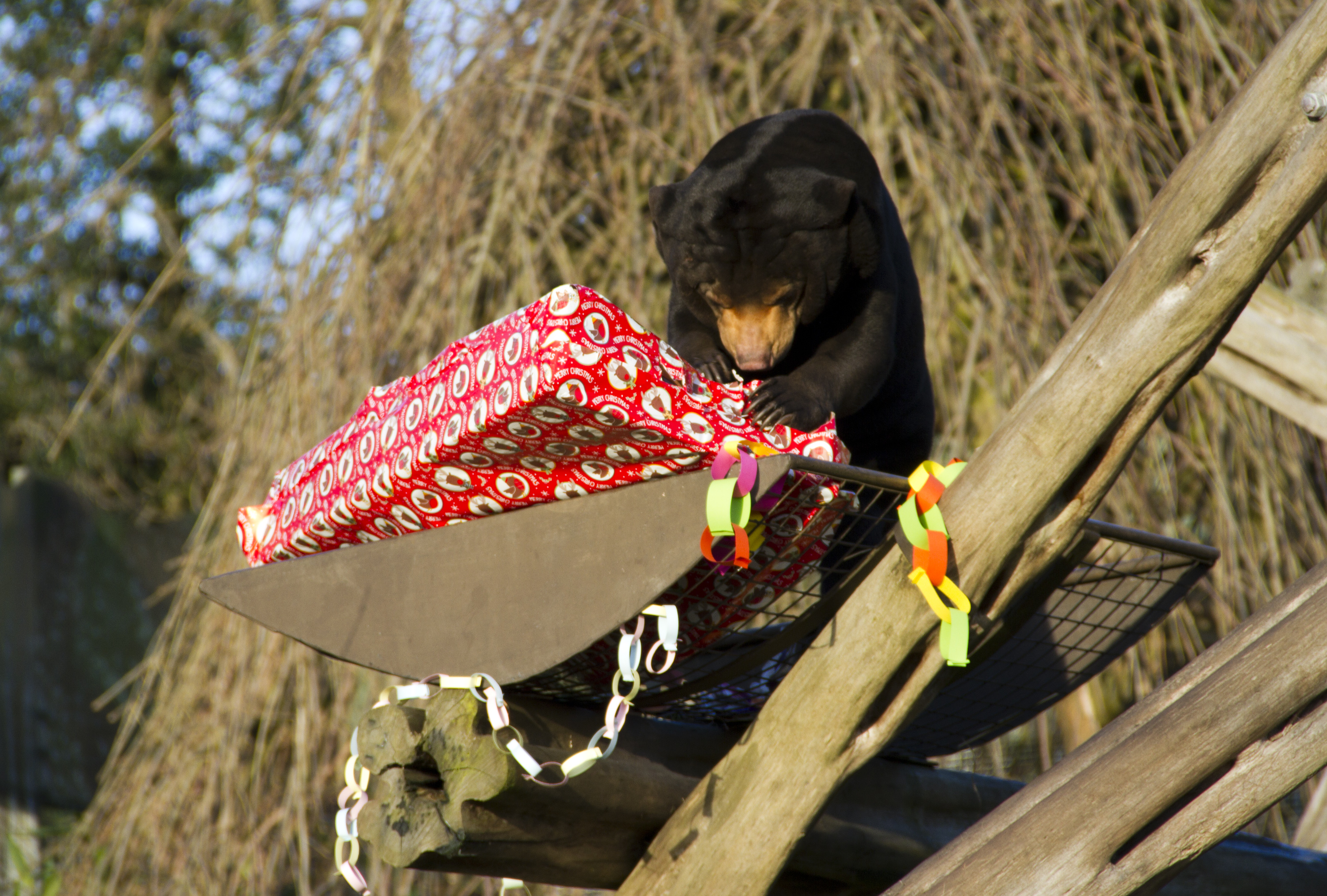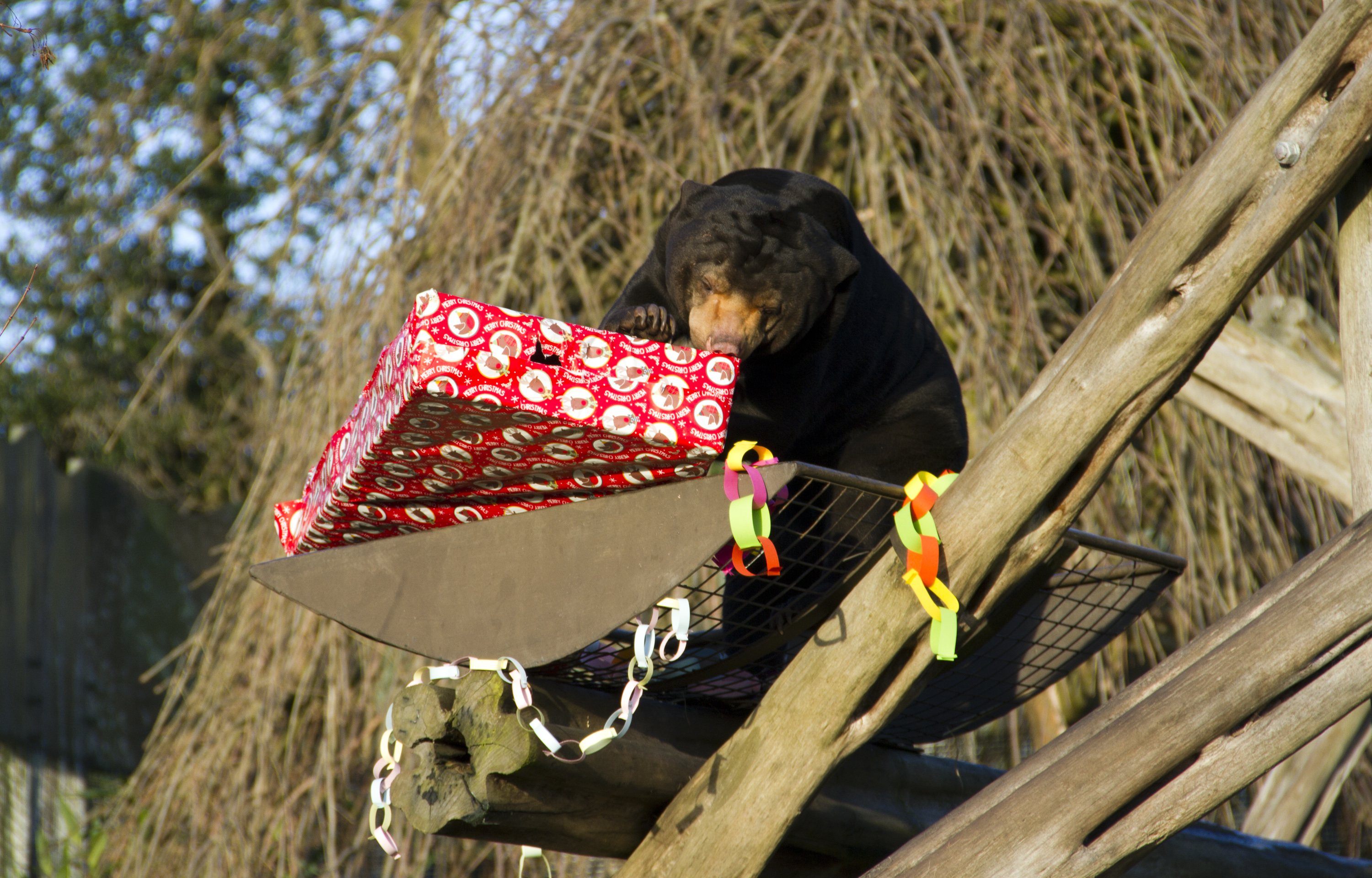 “Sun bears may be the smallest species of bear, but their size is definitely deceiving as whenever we put real pine Christmas trees into their enclosure, probably their favourite enrichment device, they wrestle them to the ground! Rotana and Somnang will also be given wrapped up cardboard boxes which they love to get their claws, noses and extra-long tongues into and tear open – Christmas will literally be coming early for the boys as they’ll be getting two lots of their favourite enrichments!”