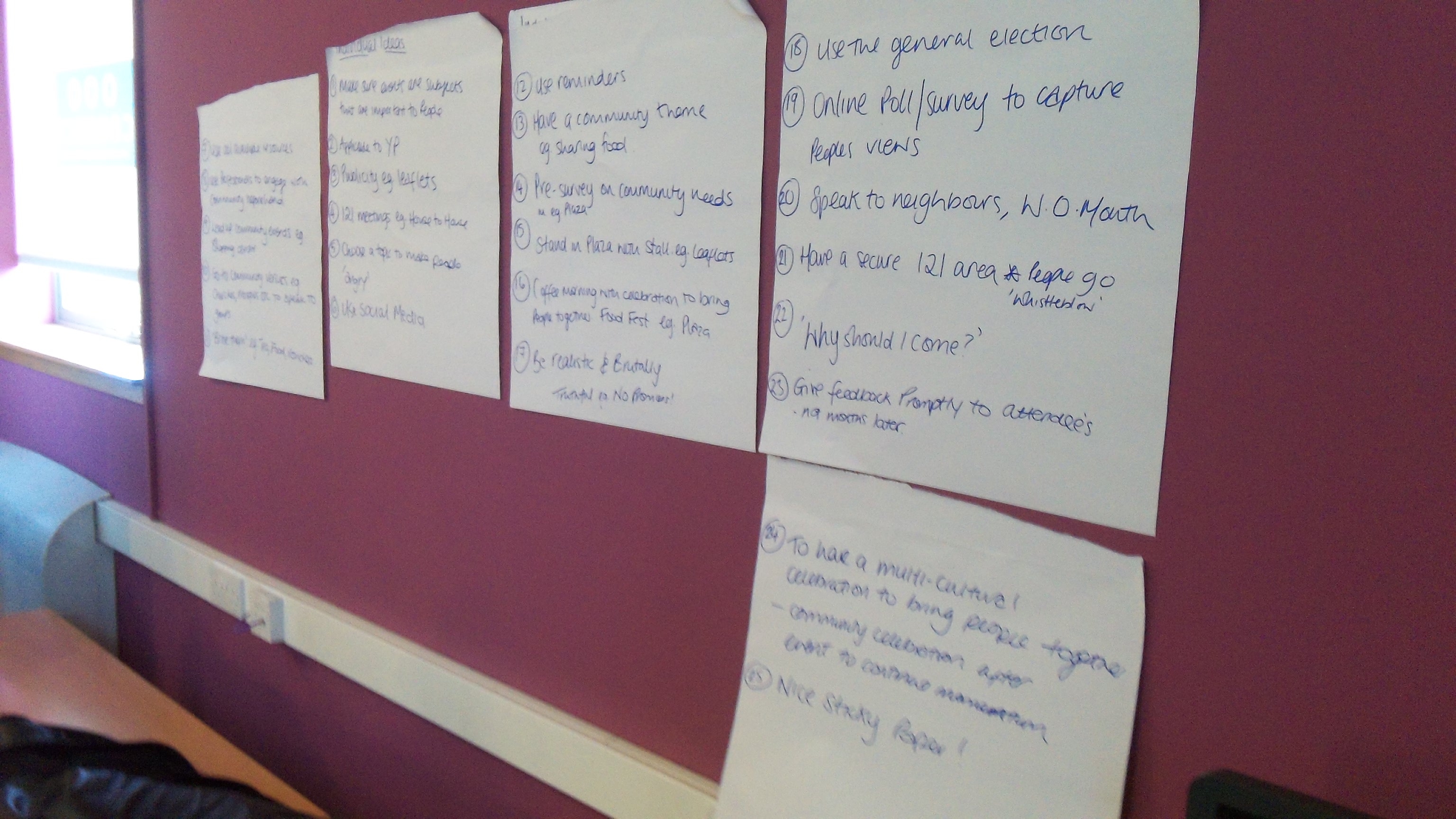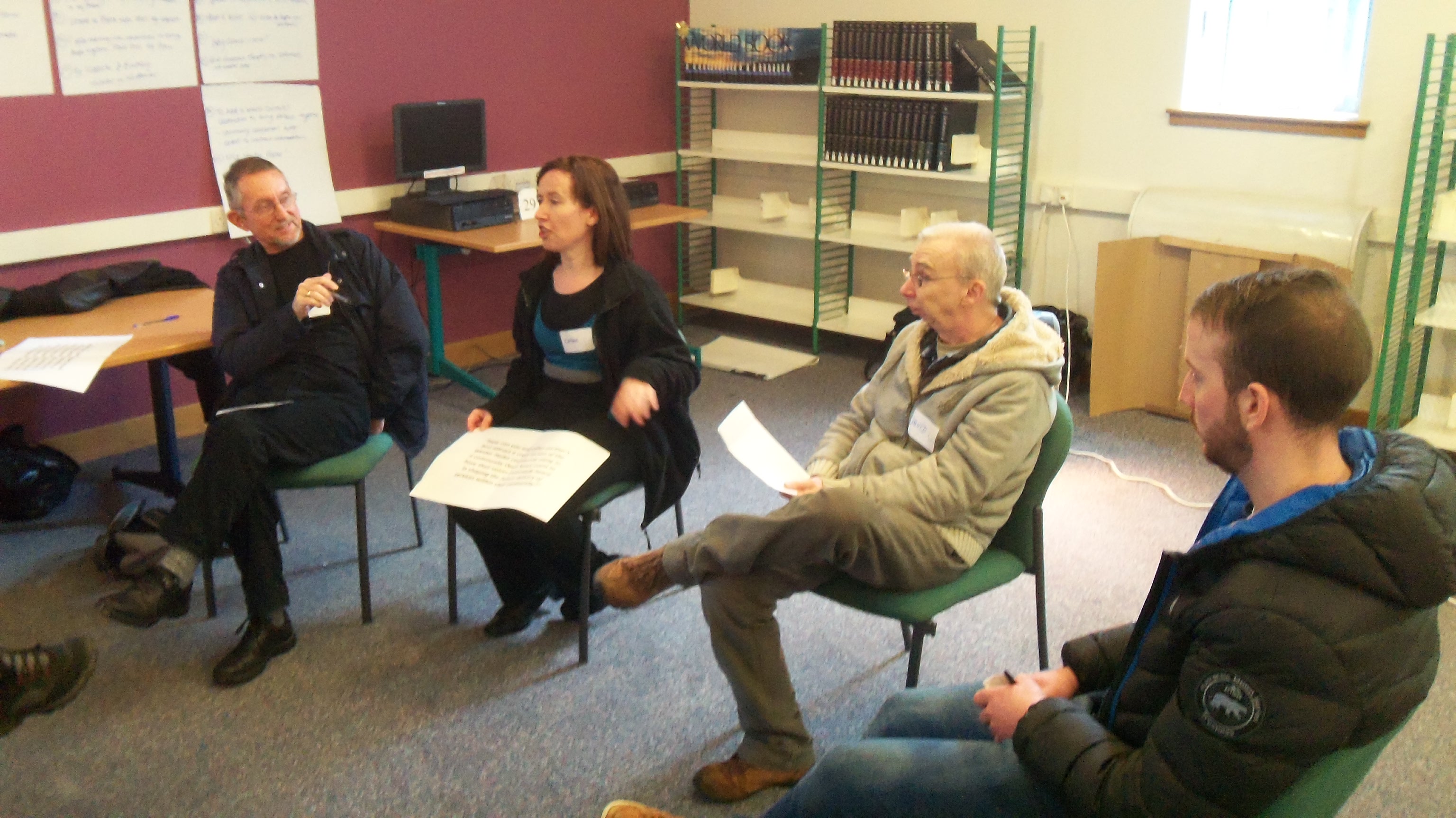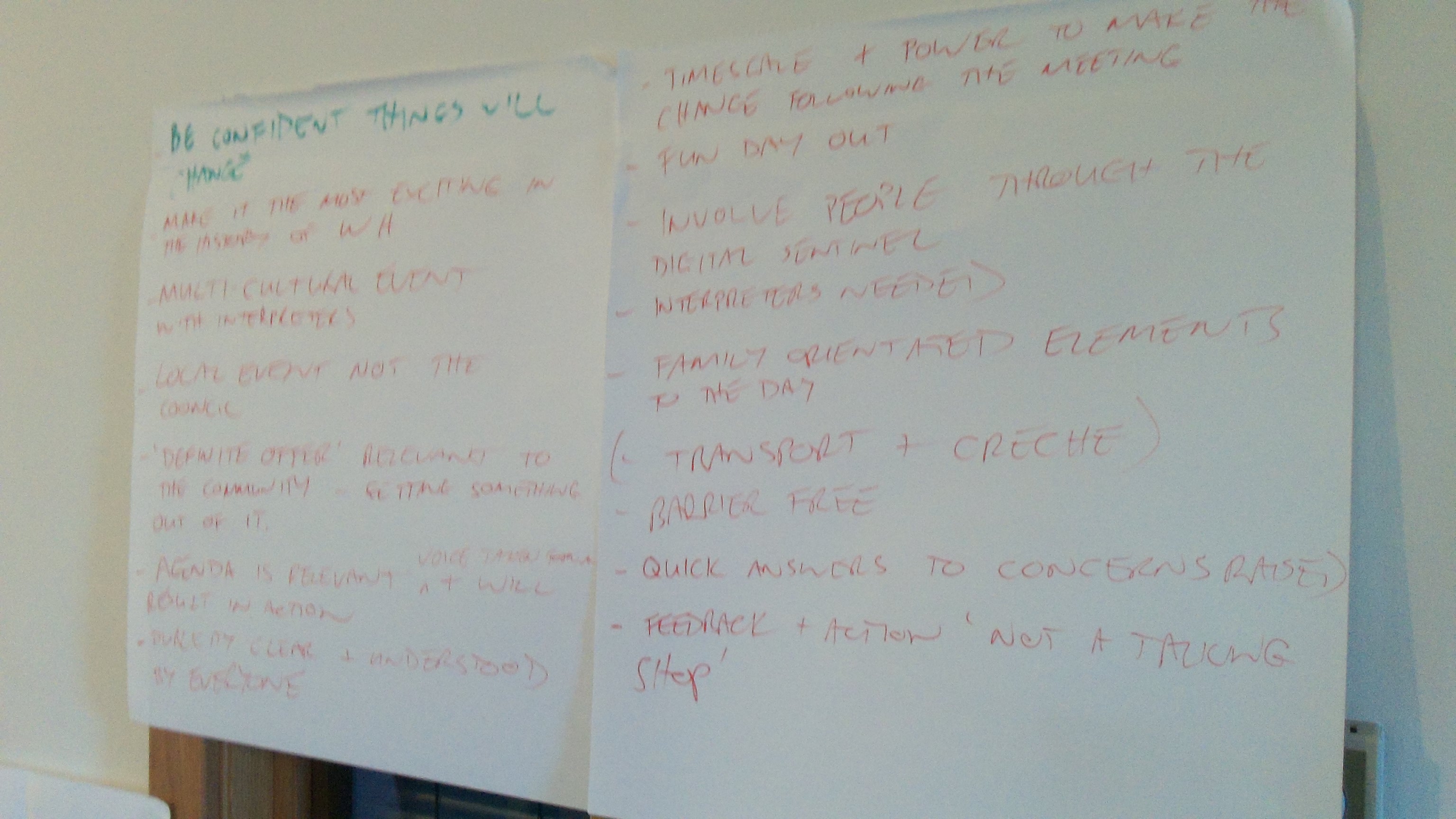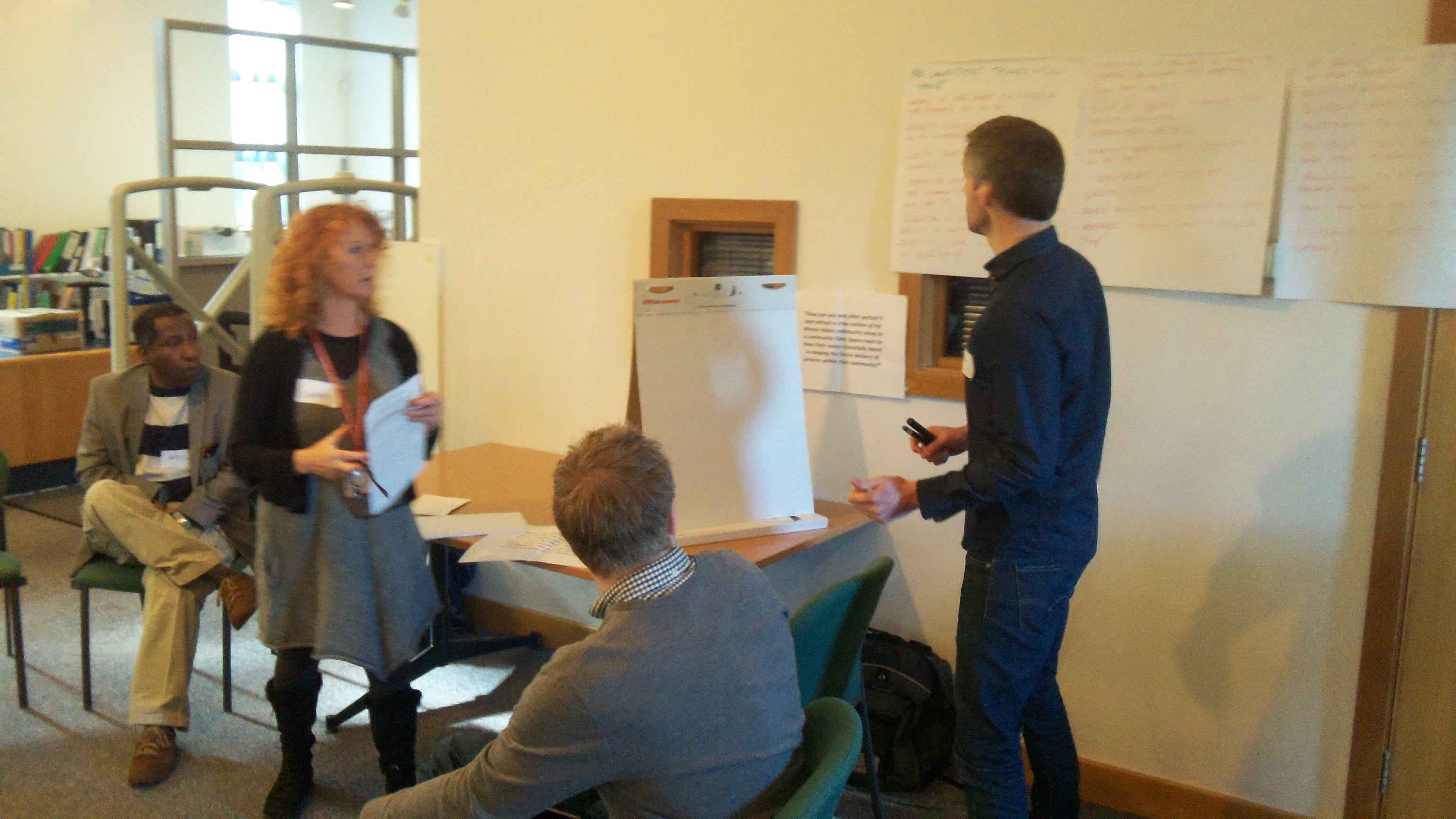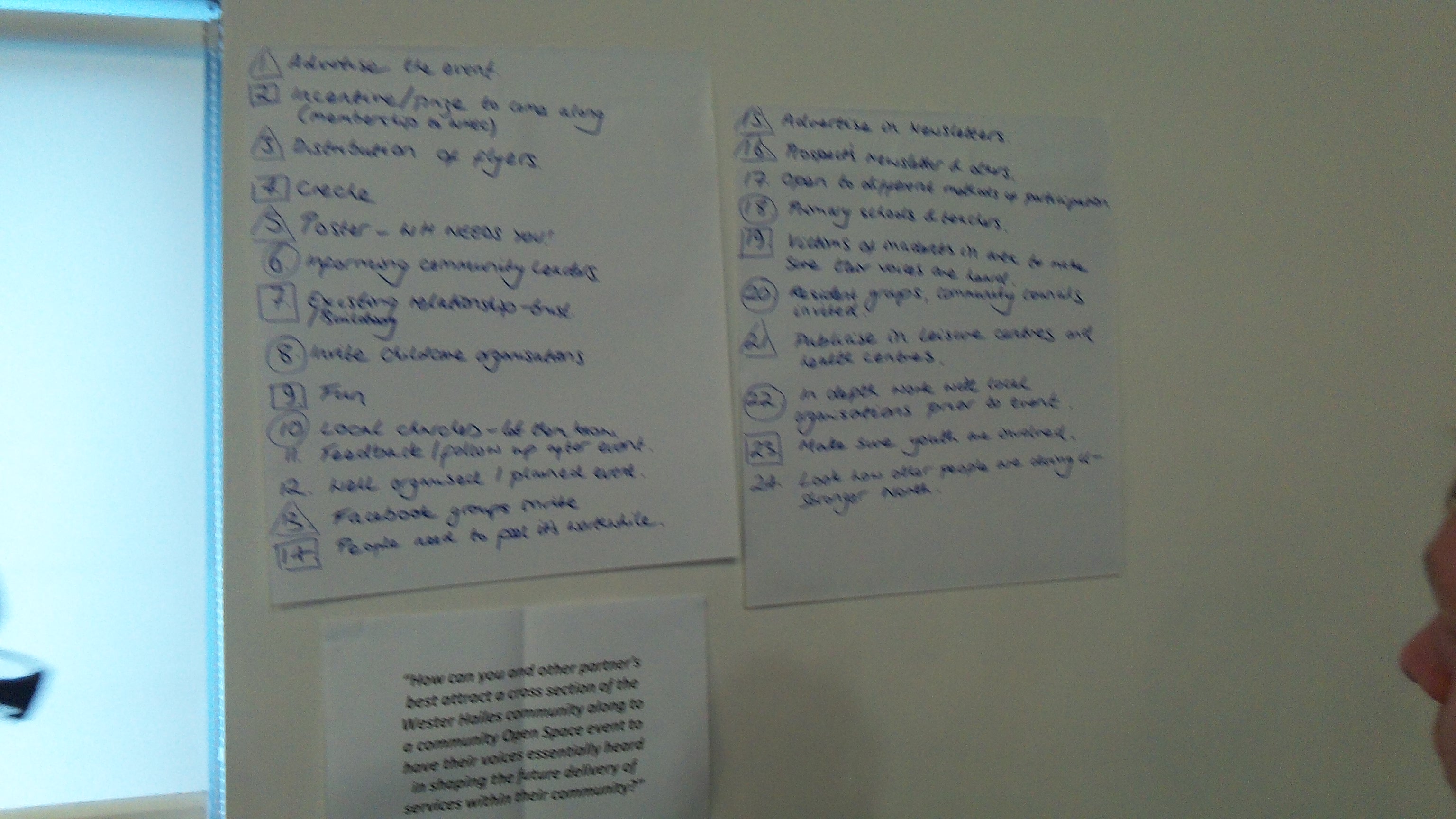 The problem being solved was how to make a future Open Space event a success. The participants were community activists or from local organisations, such as The Health Agency, the Community Council, SCOREscotland, WHALE Arts, Dads Rock, The Youth Agency and Prospect. There was much discussion regarding what would be required for the Open Space event to be attractive to as many people from Wester Hailes as possible.