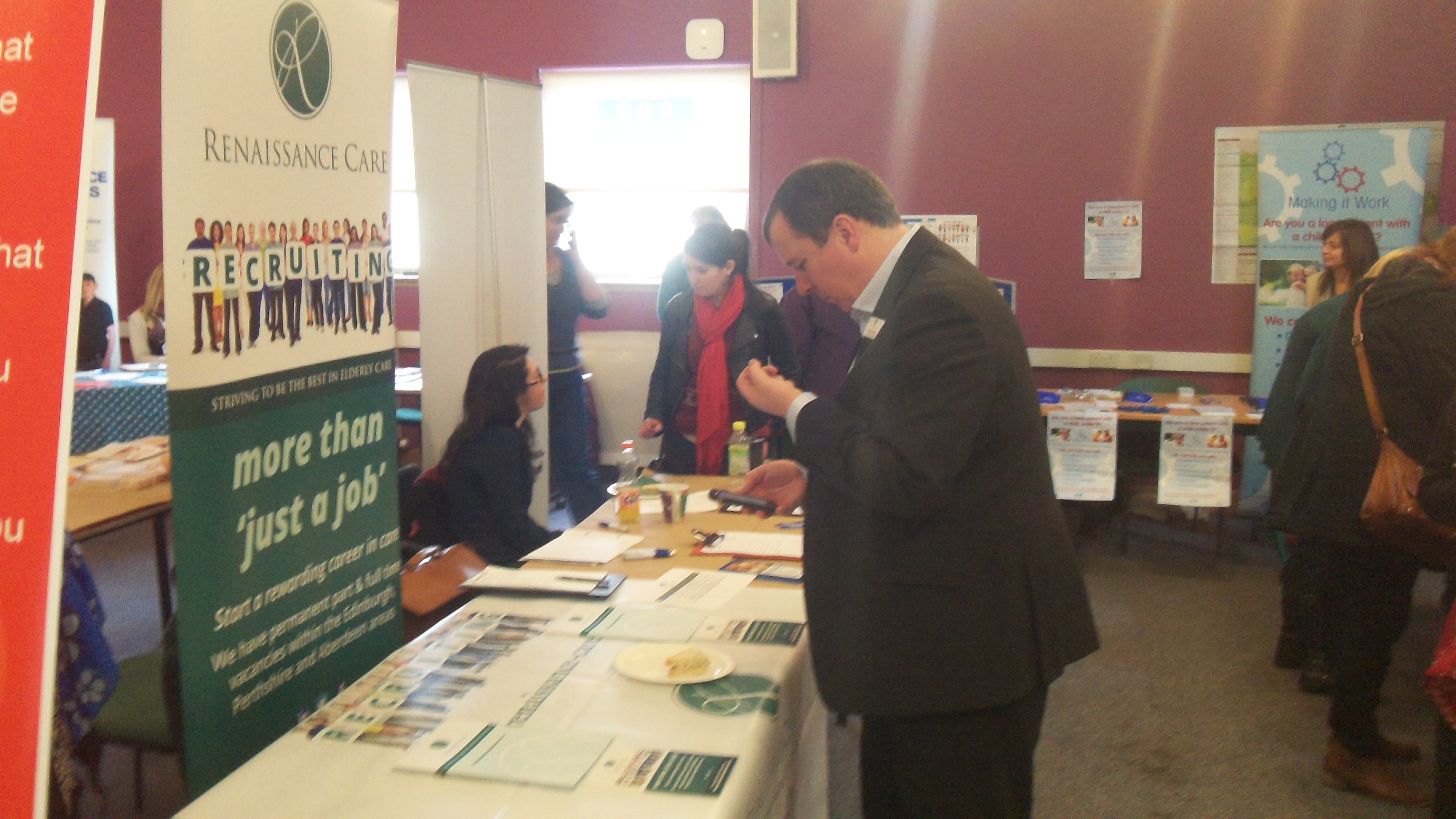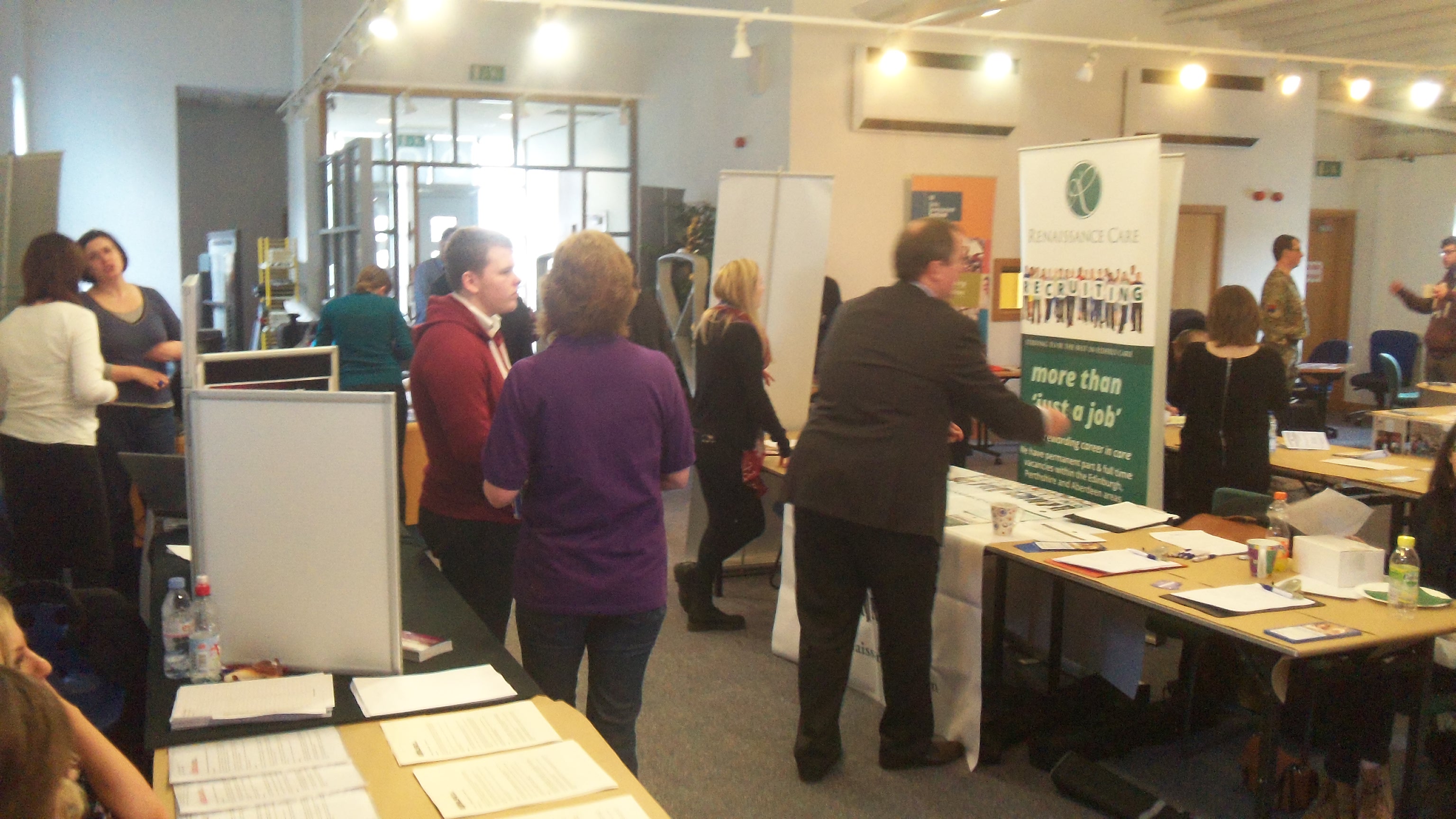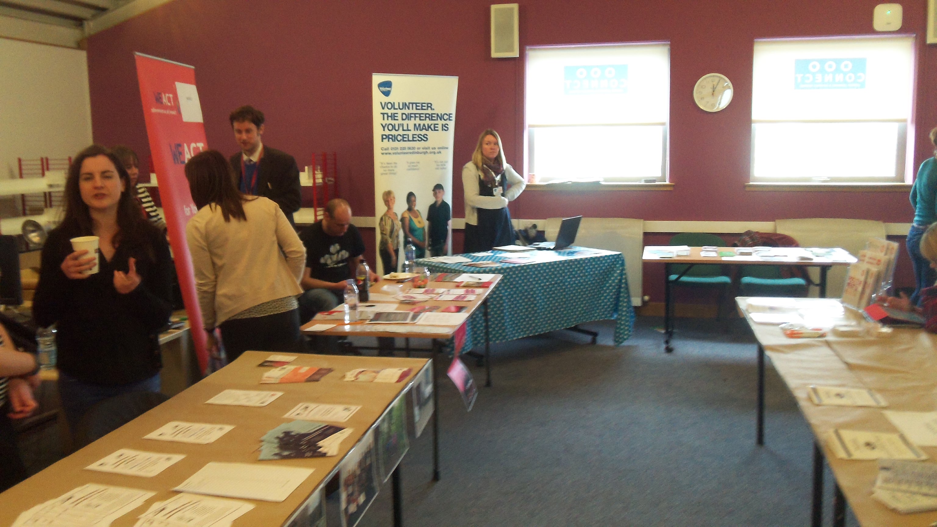 The fair ran from 10.30am – 1.30pm and was attended by numerous organisations ranging from CHAI to the Job Centre and Edinburgh College. The event was a huge success with over 100 people arriving in the first hour and visits from several nearby high schools, WHEC, St Augustines, Forresters and Tynecastle. At the time we paid the visit, at 12.30pm, around 250 people had visited the fair, with the stalls about vacancies at Edinburgh Airport and Street Soccer seeming to be particularly popular.
