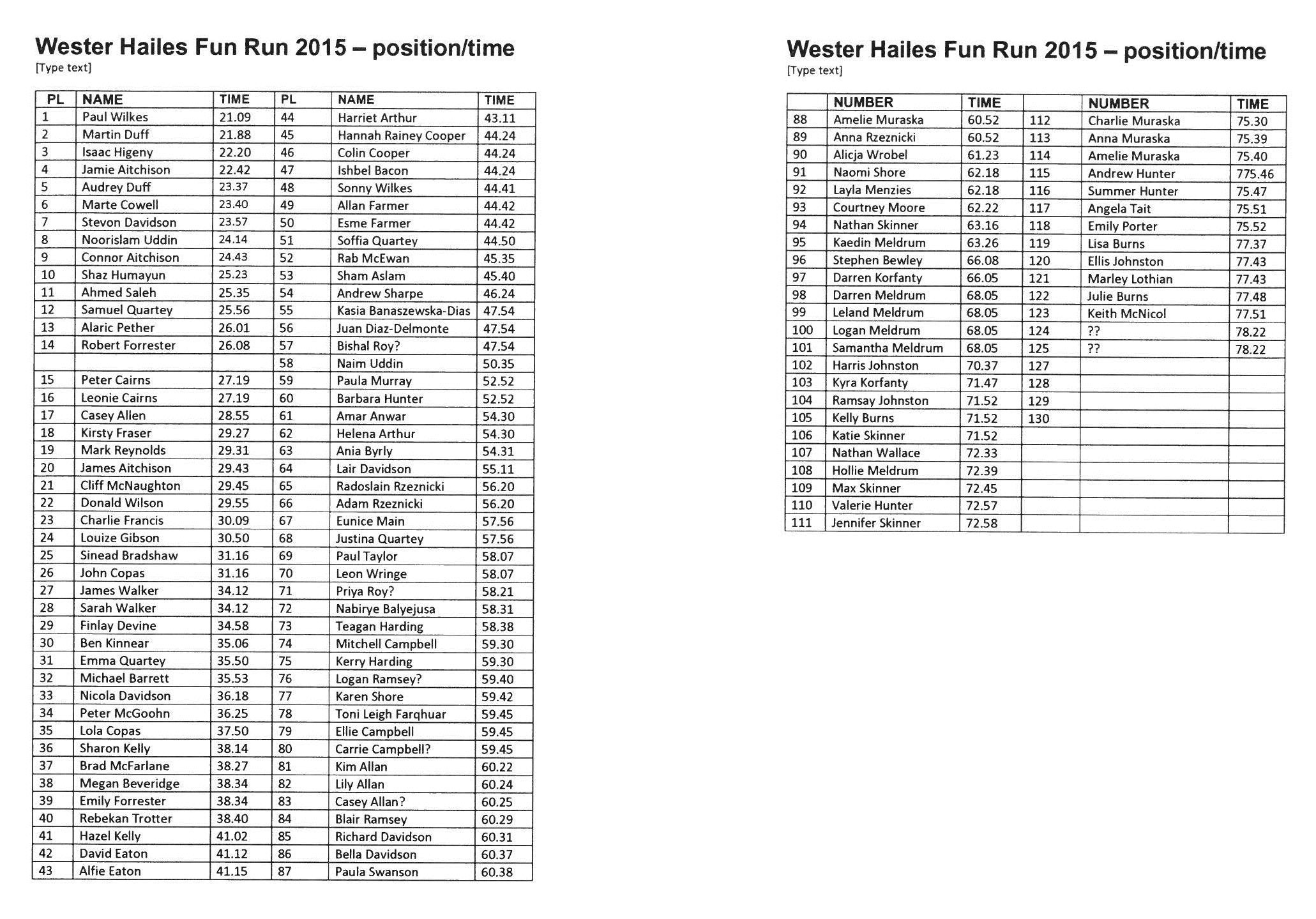 The Wester Hailes Fun Run Planning Group have collated all the finishing information so that those who took part can now see their placing and their time for the 5k route. The task of recording times and places is carried out manually at the Finish so if you took part and timed yourself there may be a slight variation. The volunteers also made every effort to identify numbers but despite best efforts could not spot everyone’s number. So if there’s a question mark by your number we weren’t 100% that this was you! Just click on the chart or the link below to find your name, time, and placing.