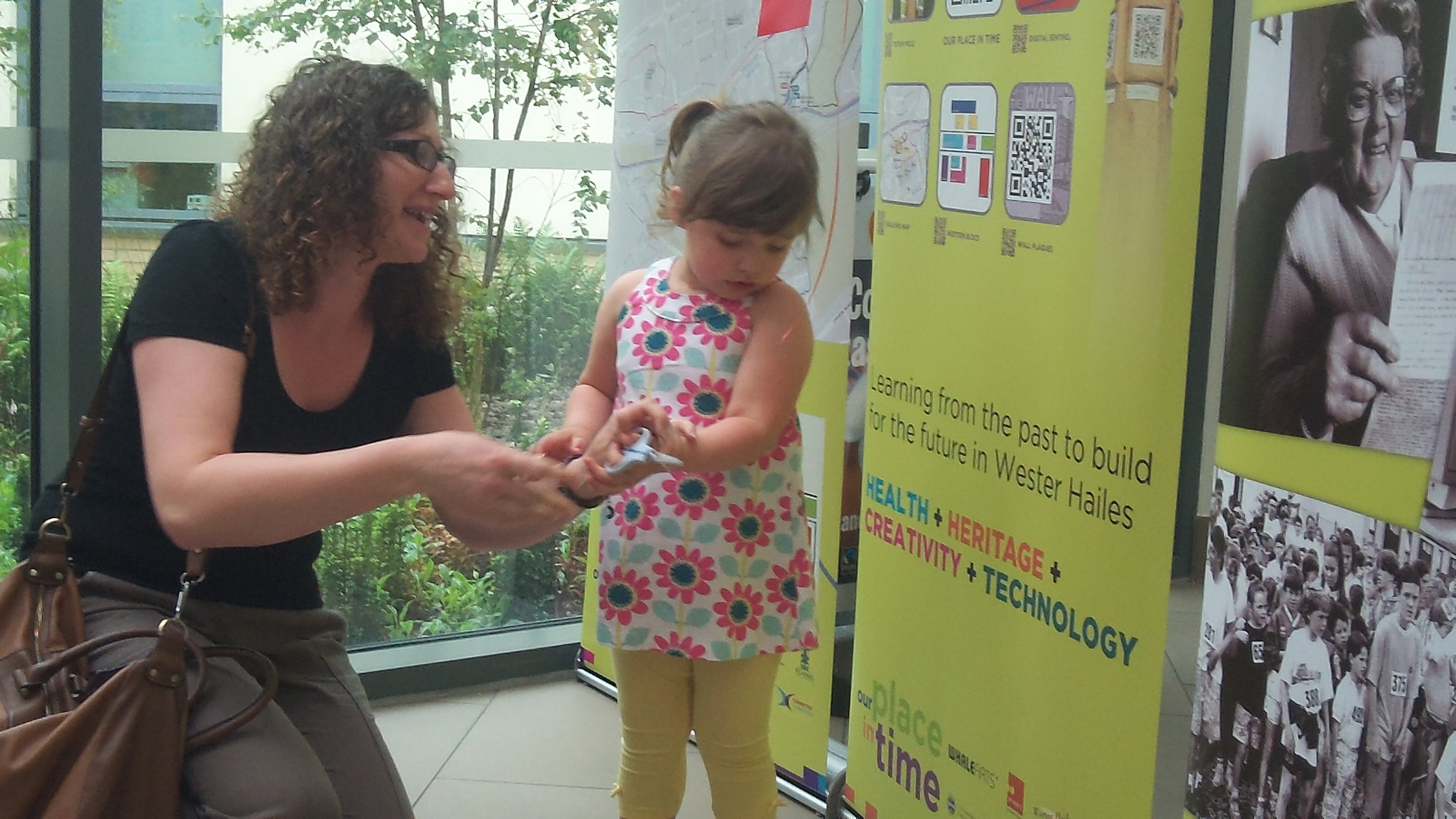 There were speeches by local resident Eoghan Howard, one of the key organisers of the exhibition, and Sean Bell who is a key figure in the managing of the Healthy Living Centre. They thanked all of the people for making the exhibition possible including the Arts and Humanities Research Council, Connected Communities project, WHALE Arts, Prospect Community Housing, the Health Agency and Our Place in Time. The highlight of the launch was the vertical ribbon cutting by special guest Weronika Diaz-Banaszewska, who was rewarded with a lollipop!
