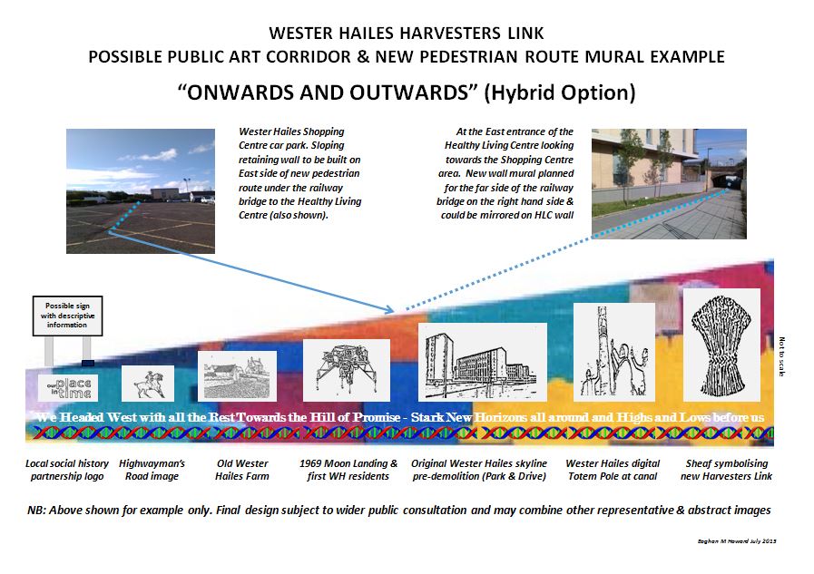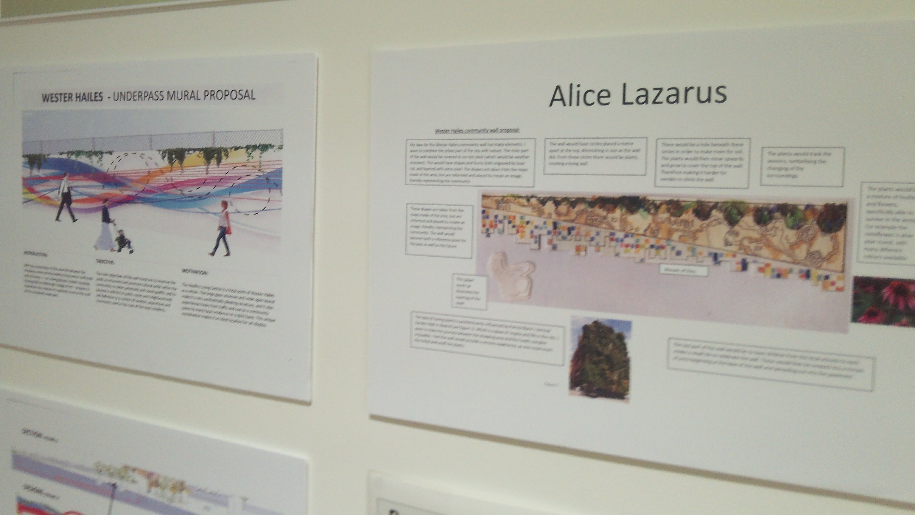 The exhibition is currently on display in the corridor of Wester Hailes Health Agency, just past the green reception in the Healthy Living Centre. The exhibition shows several possible ideas, five created by students from Edinburgh College of Art and one from a local resident, of how a completed mural could look. The exhibition welcomes members of the community to submit feedback outlining what parts of these ideas they like or even to submit their own ideas. Any feedback will be used as the basis for developing a final design which will hopefully be enjoyed by all the community, making the new link far more interesting and a nicer place to be.