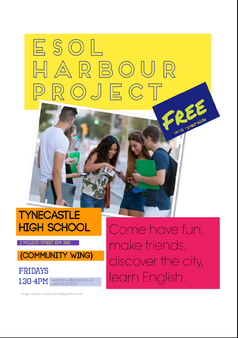 The ESOL Harbour Project (English for Speakers of Other Languages) will be meeting at Tynecastle High School community wing, 2 Mcleod Street EH11 2ND, on Fridays, 1.30pm – 4.00pm.