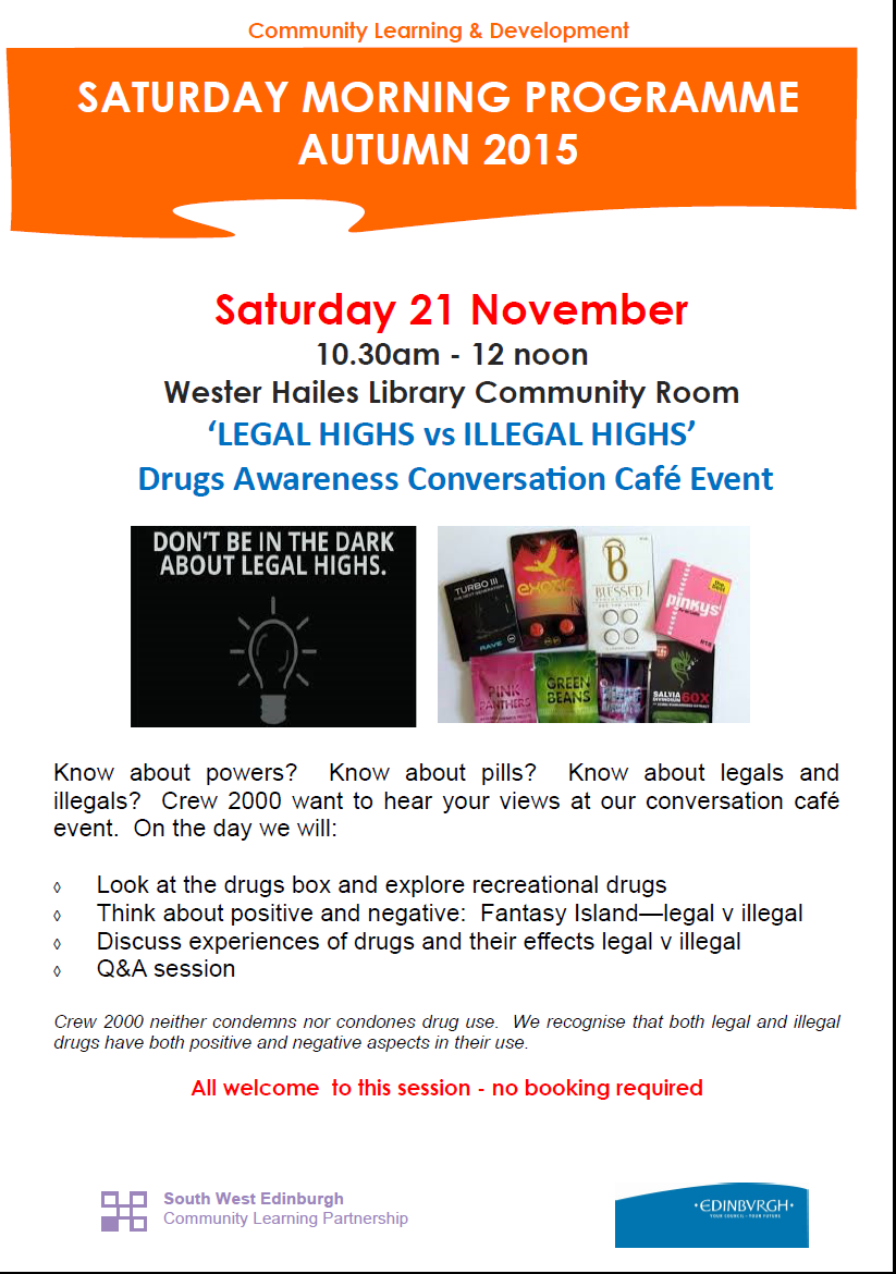 Saturday Morning Programme Legal Highs Information Session There will be a legal highs information session on Saturday 21 November 2015, at Wester Hailes Library Community Room,...
