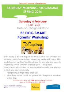 The Dog Smart workshops, ran by Dogs Trust, will begin with a children’s workshop for P1 – P7 at Gate 55, 10.15am – 11.15am. This will be followed by a parents workshop from 11.30am – 12.30pm.
