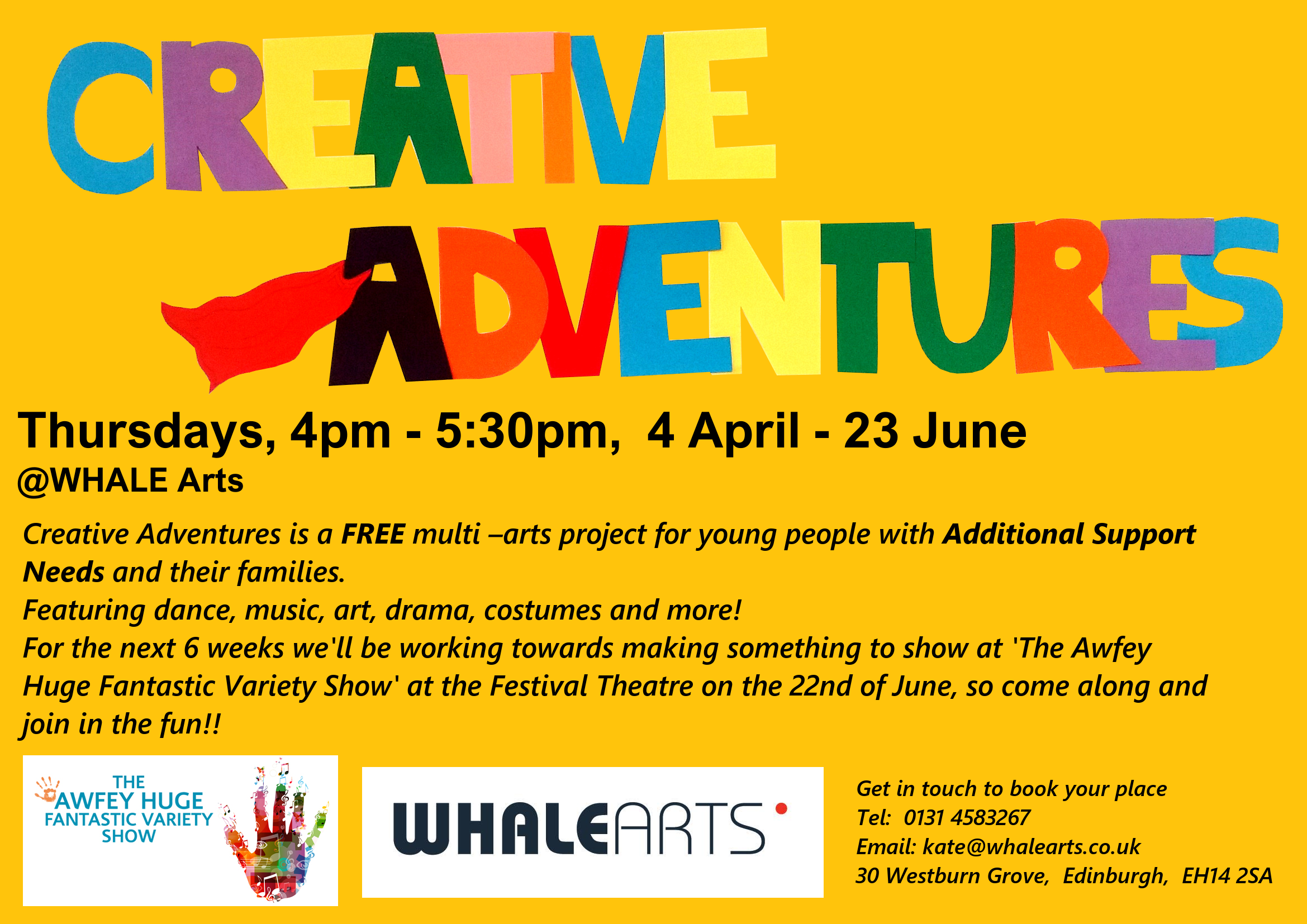 The project runs on Thursdays, 4.00pm – 5.30pm at the WHALE Arts Centre. For more information or to book your place contact Kate at 0131 458 3267 or kate@whalearts.co.uk.