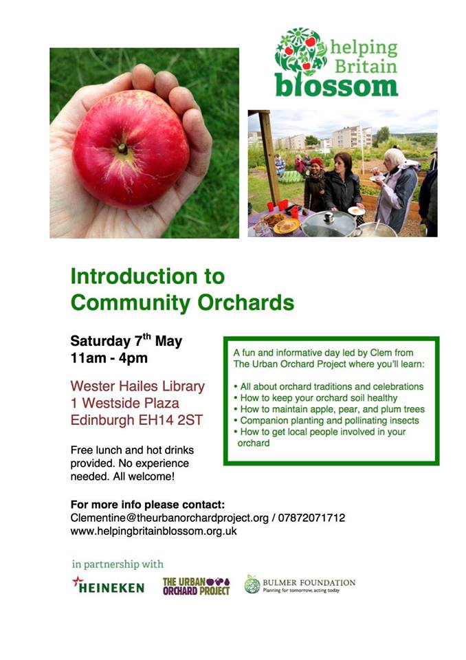 Helping Britain Blossom will be holding an introduction to community orchards session at Wester Hailes Library on Saturday 7 May 2016, 11.00am – 4.00pm.