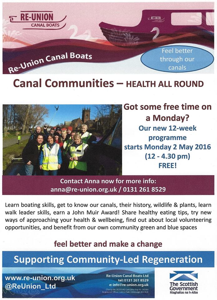 Re-Union Canal Boats have announced that they will be holding an information session at 12noon, Monday 2 May, aboard the Lochrin Belle at Edinburgh Quay, Fountainbridge for anyone interested in participating in the next round of their Canal Communities Health All round project
