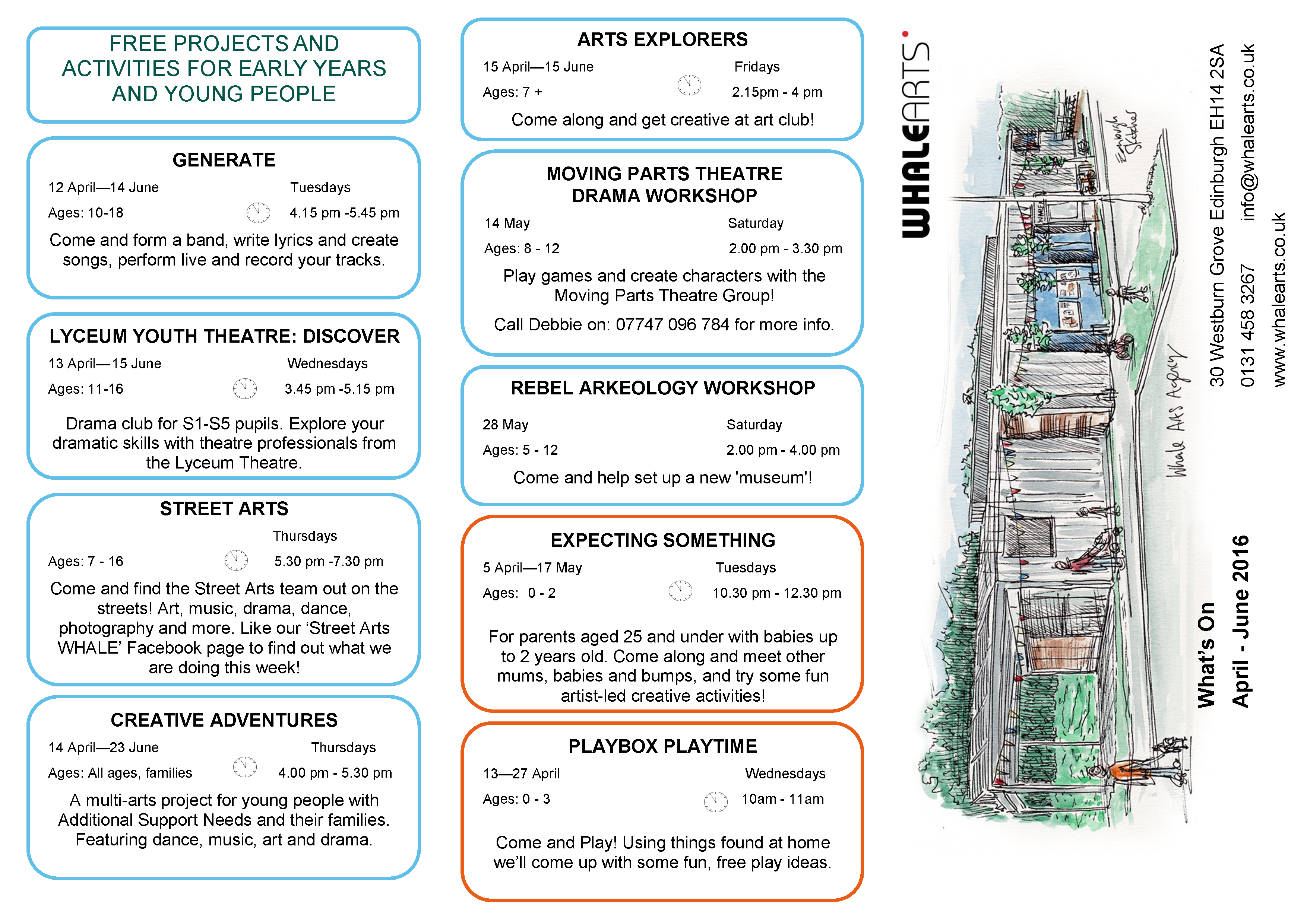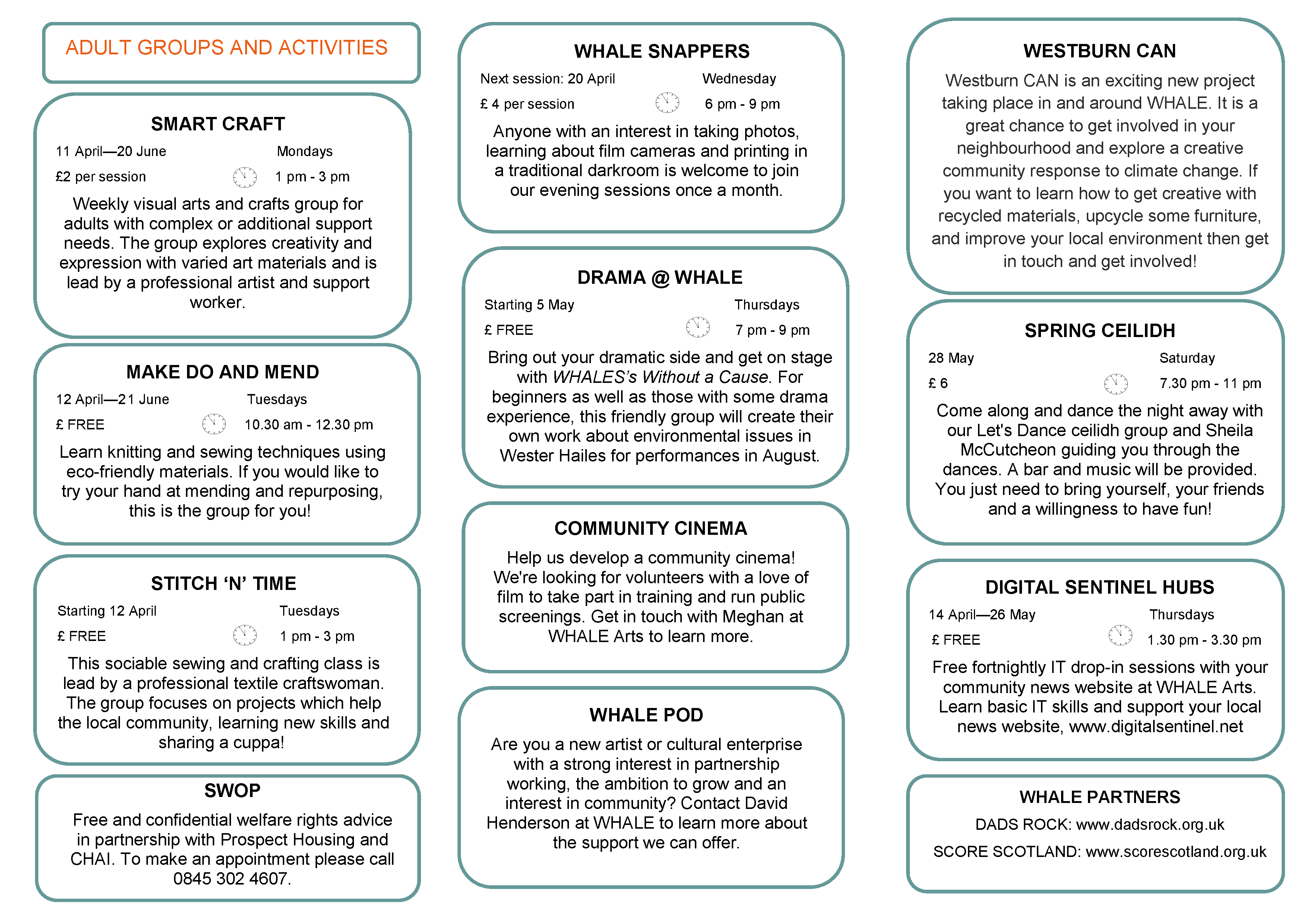 You can see the programme below which ranges from April to June 2016. The programme details all of WHALE’s regular classes and events as well as exciting new projects including their new community cinema group and the Westburn CAN project.