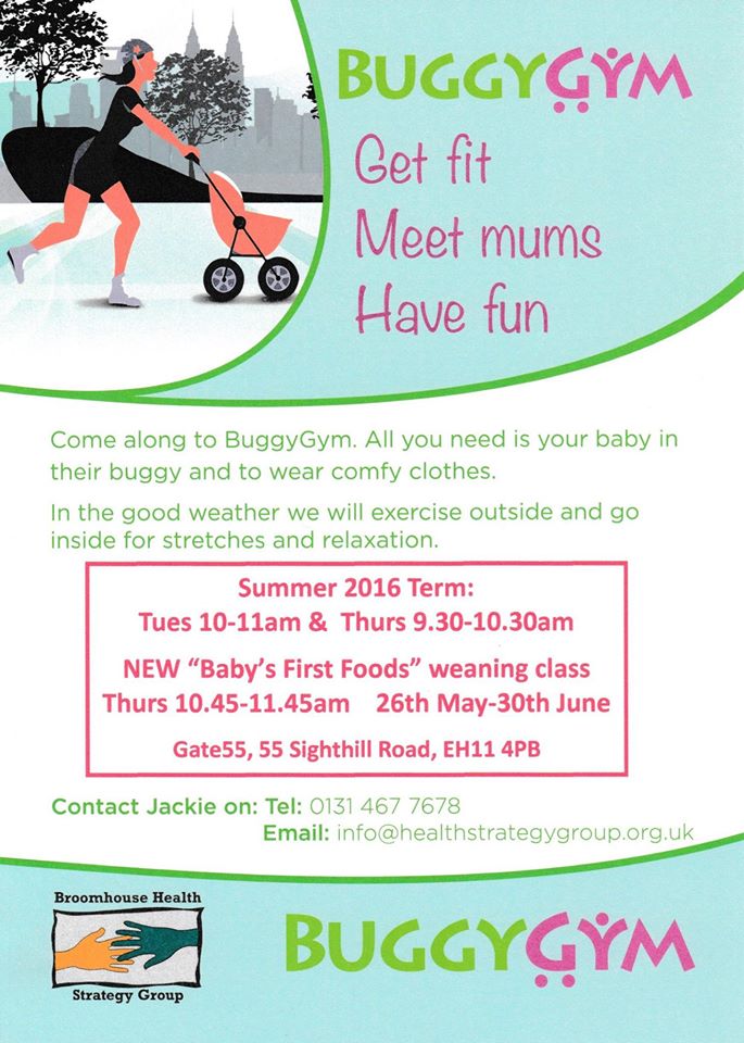 The Broomhouse Health Strategy Group’s Buggygym sessions are now running on Tuesdays, 10.00am – 11.00am and Thursdays, 9.30am – 10.30am at Gate 55, 55 Sighthill Road.