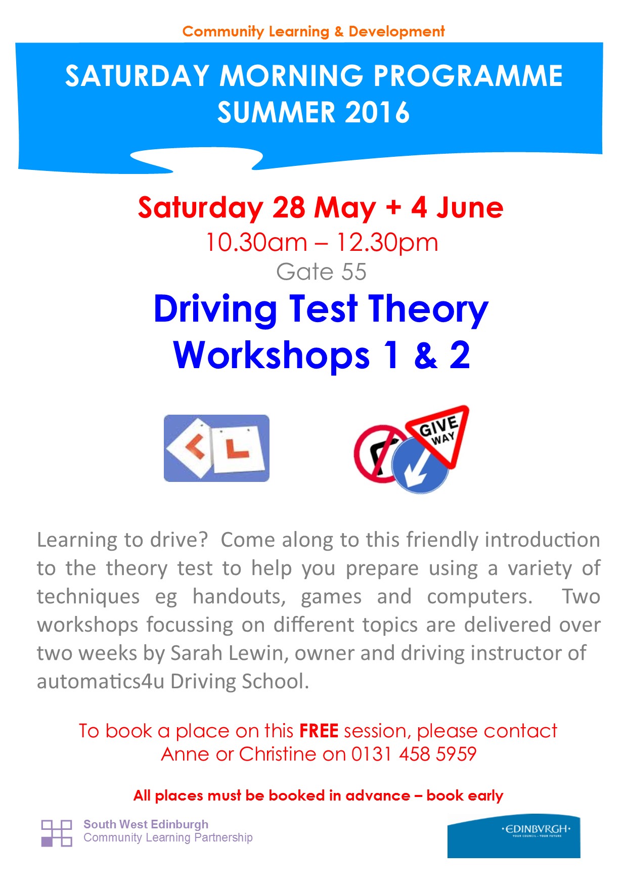 There will be two free driving test theory workshops on Saturday 28 May and Saturday 4 June 2016, 10.30am – 12.30pm at Gate 55.