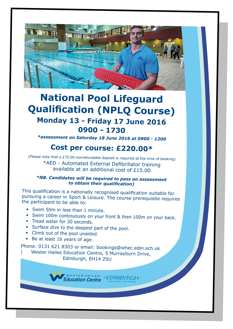 A National Pool Lifeguard Qualification Course will be running at WHEC from Monday 13 – Friday 17 June 2016, 9.00am-5.30pm with an assessment on Saturday 18 June 9.00am-12 noon.