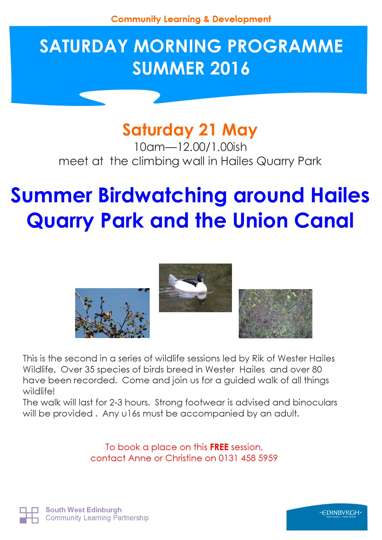 The walk is part of Community Learning and Development’s Saturday Morning Programme and will be led by Rik Morley from Wester Hailes Wildlife. The group will meet at the climbing wall in Hailes Quarry Park. The walk will last around two to three hours so make sure you are wearing appropriate footwear. Binoculars will be provided. Please not that anyone under 16 years-old must be accompanied by an adult.