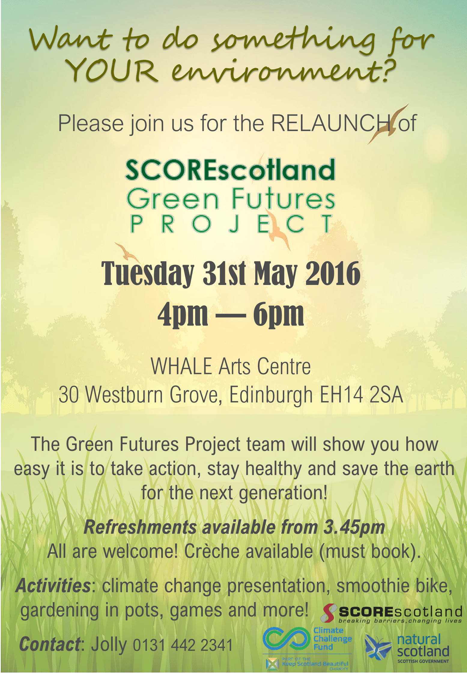 SCOREscotland have announced that they will be relaunching their Green Futures Project on Tuesday 31 May 2016, 4.00pm – 6.00pm at the WHALE Arts Centre, 30 Westburn Grove.