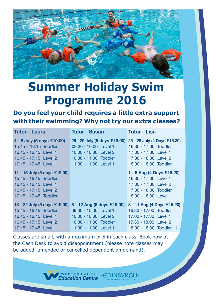 Wester Hailes Education Centre has announced that they will be running a Summer Holiday swim programme from 4 July 2016 through to 11 August.
