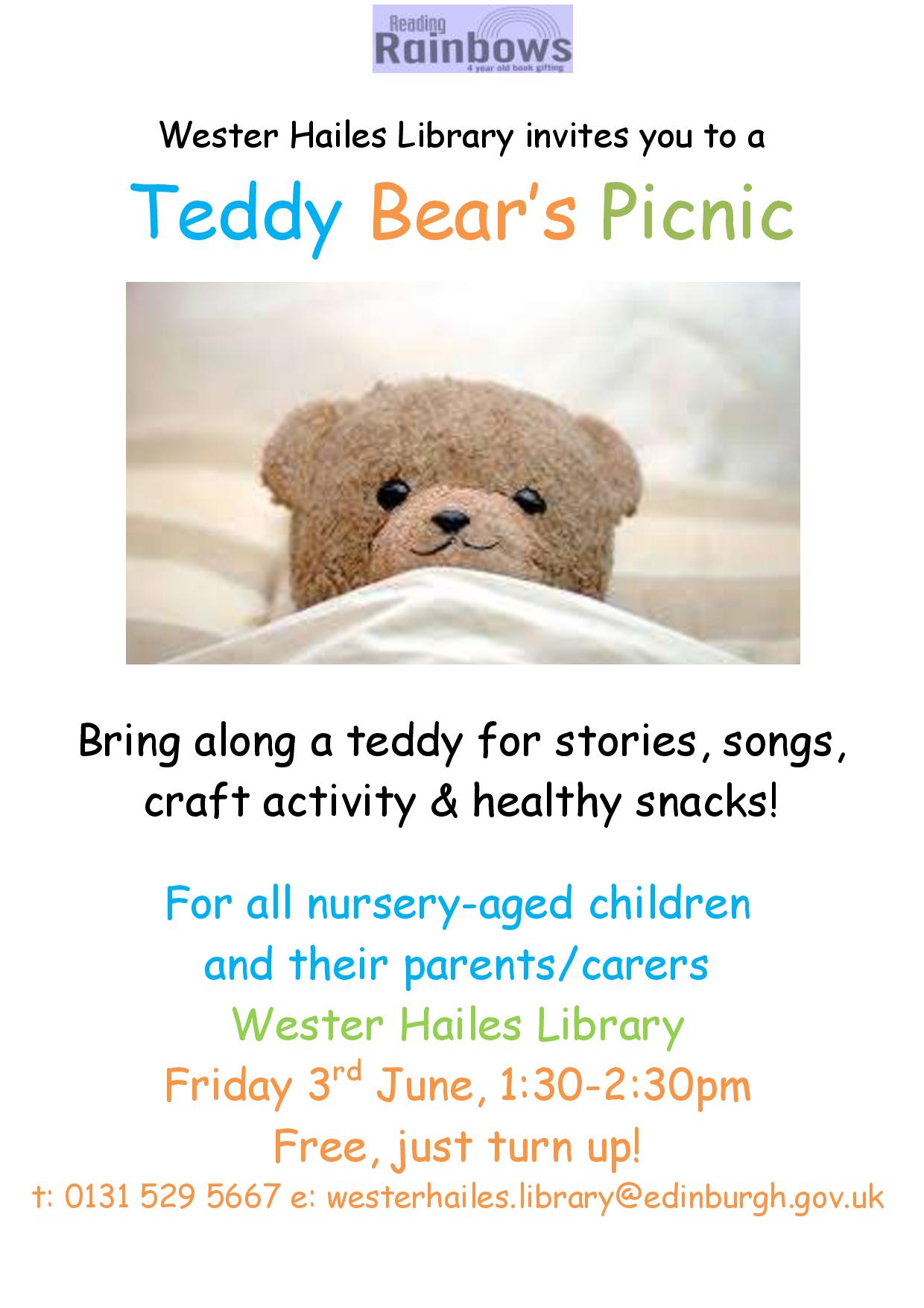 Wester Hailes library would like to invite every local teddy bear and their owners along to a Teddy Bear’s Picnic at the library on Friday 3 June 2016, 1.30pm – 2.30pm.