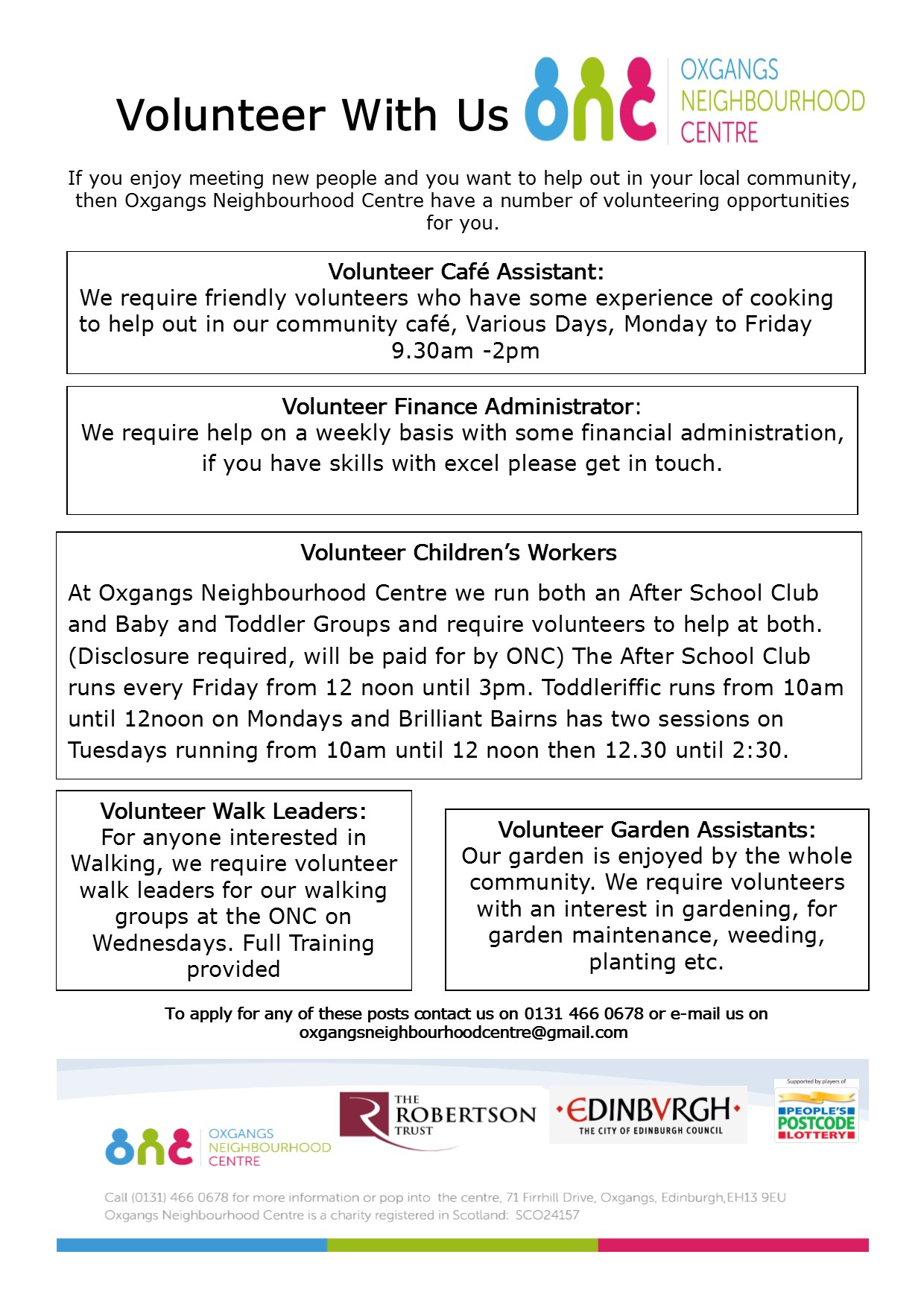 Have a look at the poster below for full details for the positions. To apply for any of the posts contact the centre on 0131 466 0678 or oxgangsneighbourhoodcentre@gmail.com.