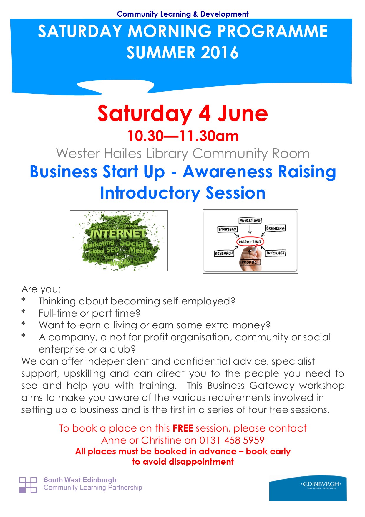 The Business Gateway Workshop will be holding a series of business startup classes as part of Community Learning and Development’s Saturday Morning Programme.