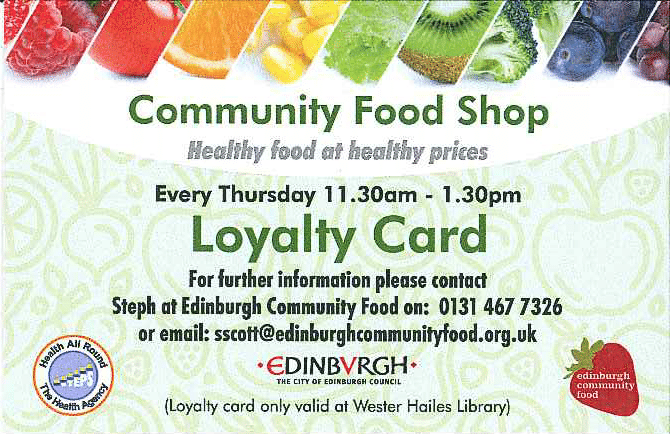 The cards which can be picked up at several community venues as well as at the food shop, which meets every Thursday, 11.30am – 1.30pm at Wester Hailes library.