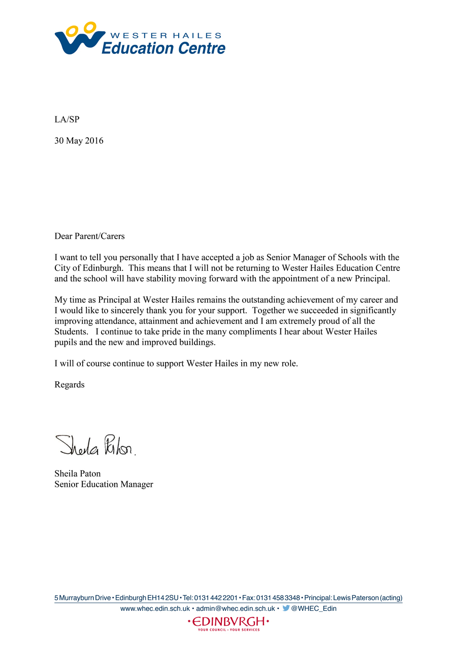 Wester Hailes Education Centre has released a letter today to all its pupils from Sheila Paton detailing that she will not be returning as Head Teacher of the school.