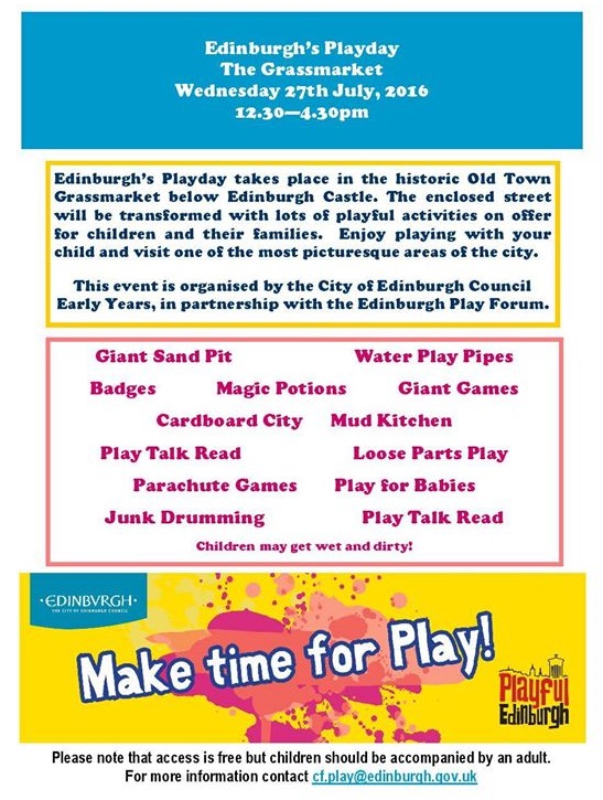This free event is organised by the City of Edinburgh Council Early Years in partnership with the Edinburgh Play Forum. For more information have a look at the poster below or contact cf.play@edinburgh.gov.uk.