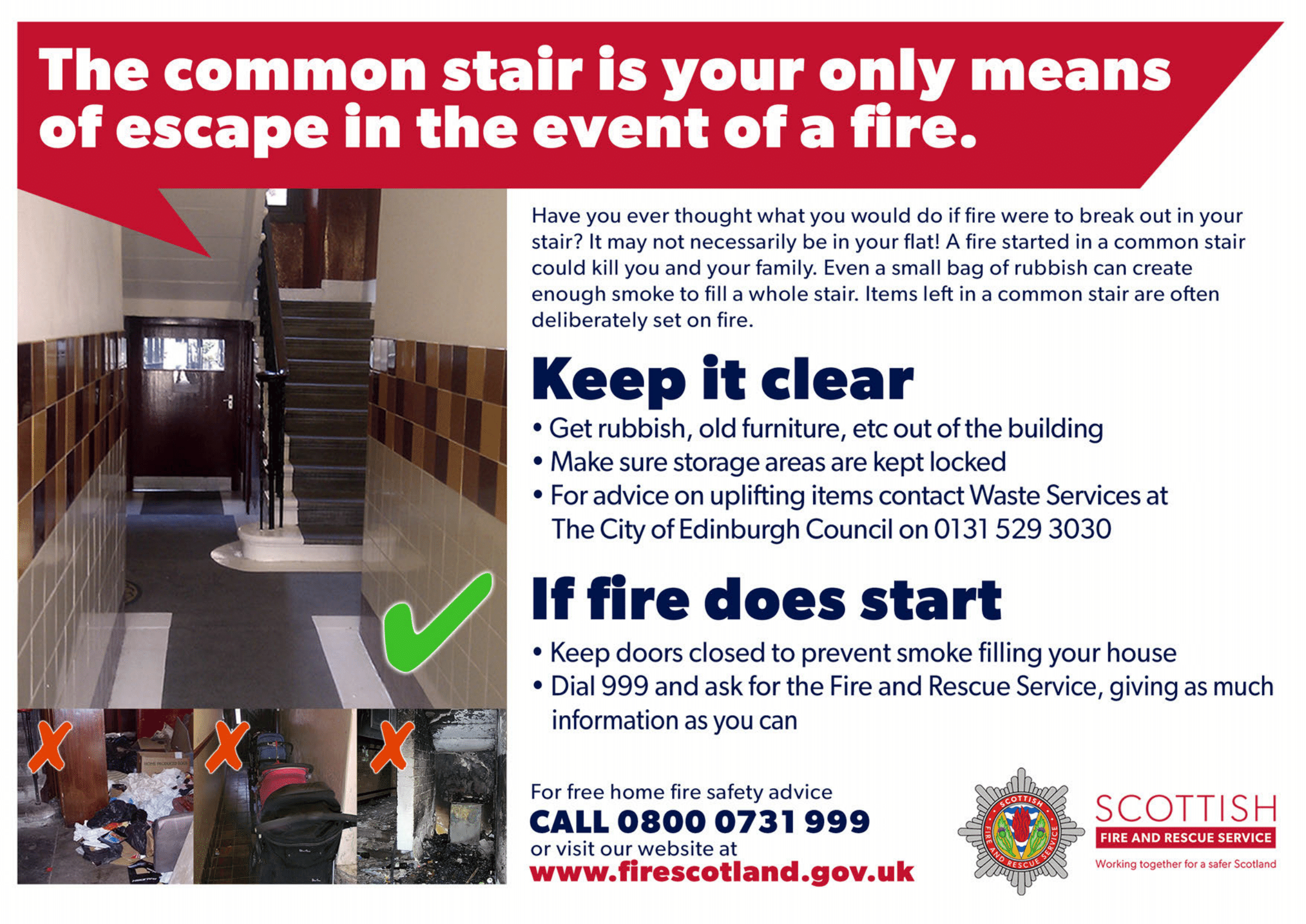 You can reduce the risk of fire, for yourself and your neighbours, by keeping common stairs clear and free from obstruction and making sure the main entrance doors are kept closed and secure. Steps should be taken to ensure the door entry/intercom system is maintained and in good working order. People should not leave rubbish or bins in the common stairwells of tenement blocks, as this can attract fire-setters and increase the risk of fire. Discarded items of furniture and rubbish can produce large amounts of toxic smoke as well as impede access for emergency responders.