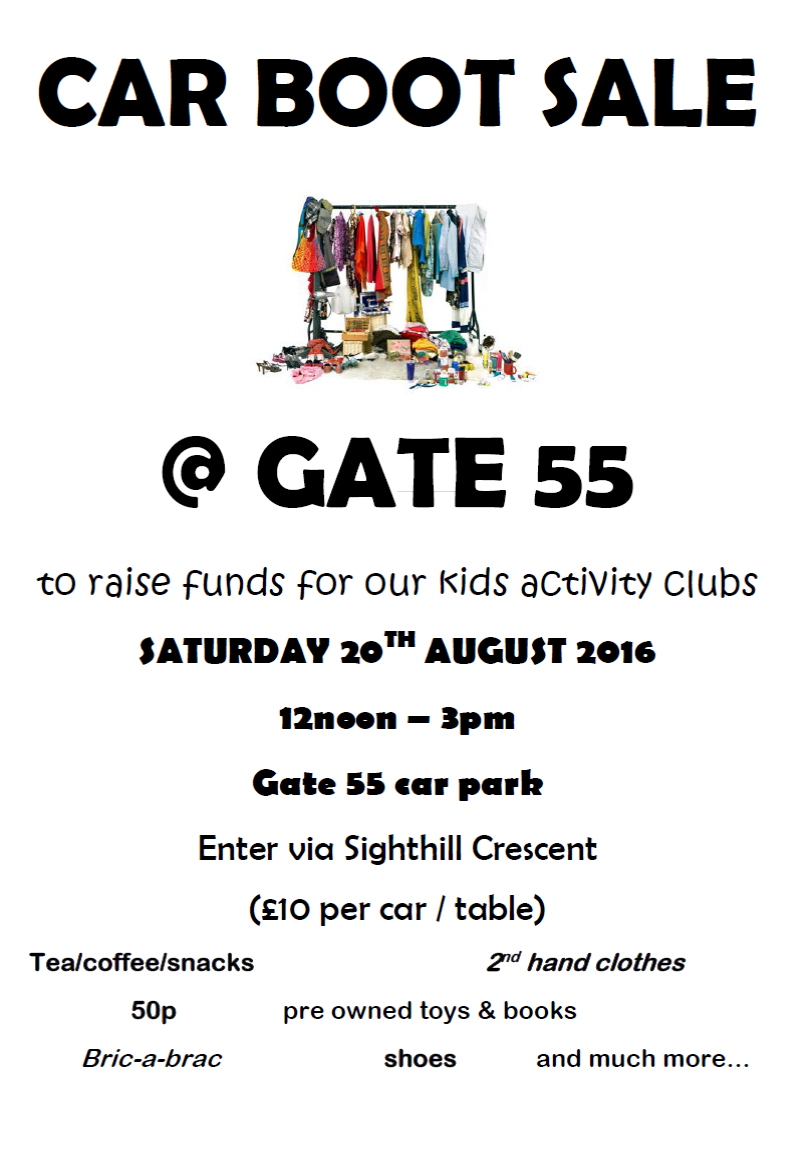 Gate 55 has announced that they will be holding a Car Boot Sale on Saturday 20 August 2016, 12 noon – 3.00pm.