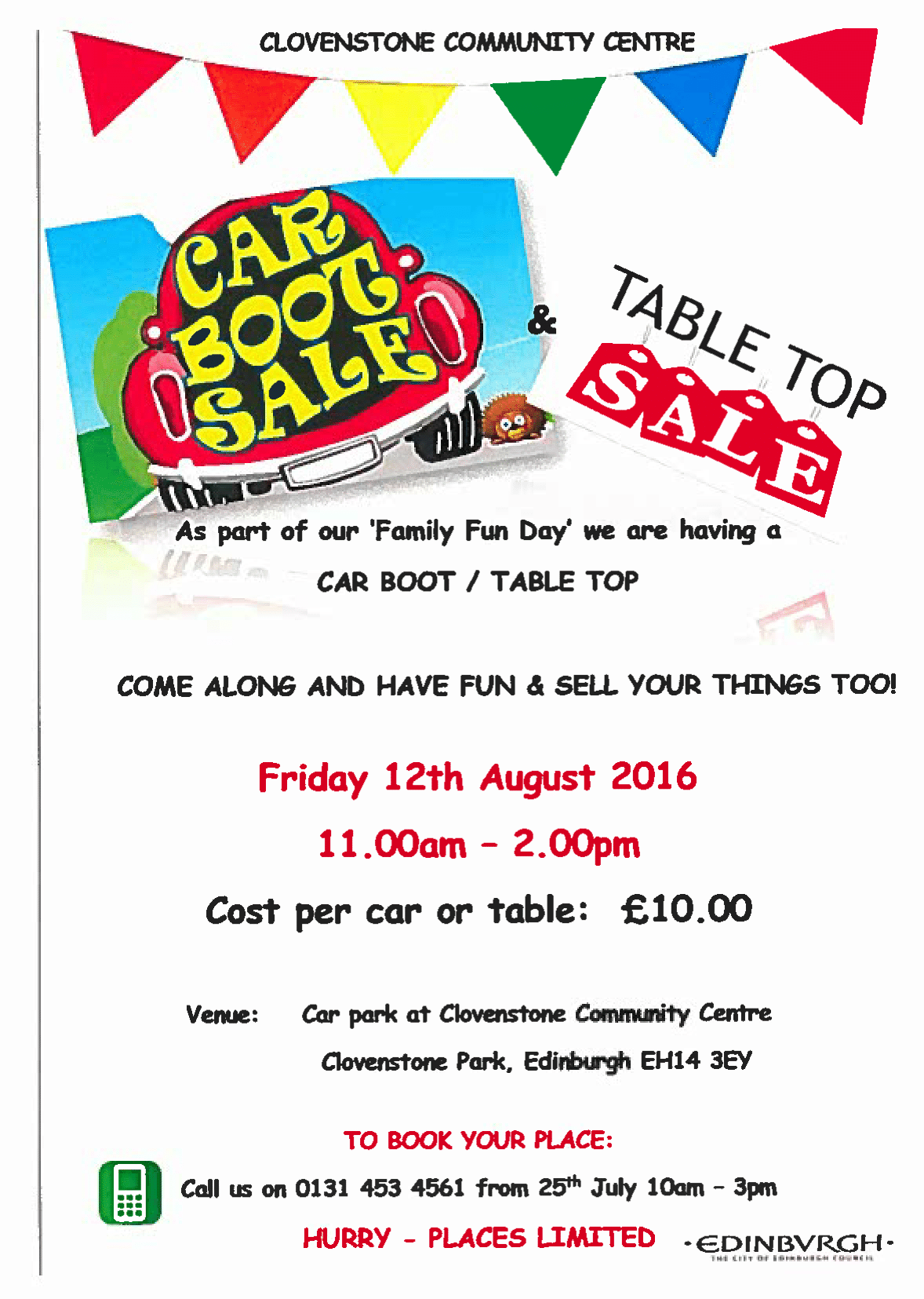 Cars or Tables cost £10.00, with the sale taking place in the car park outside the Community Centre.