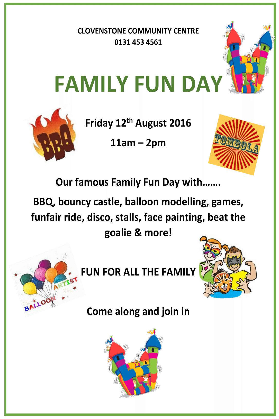 Clovenstone Community Centre will hold their Family Fun day this Friday 12 August 2016, 11.00am – 2.00pm.