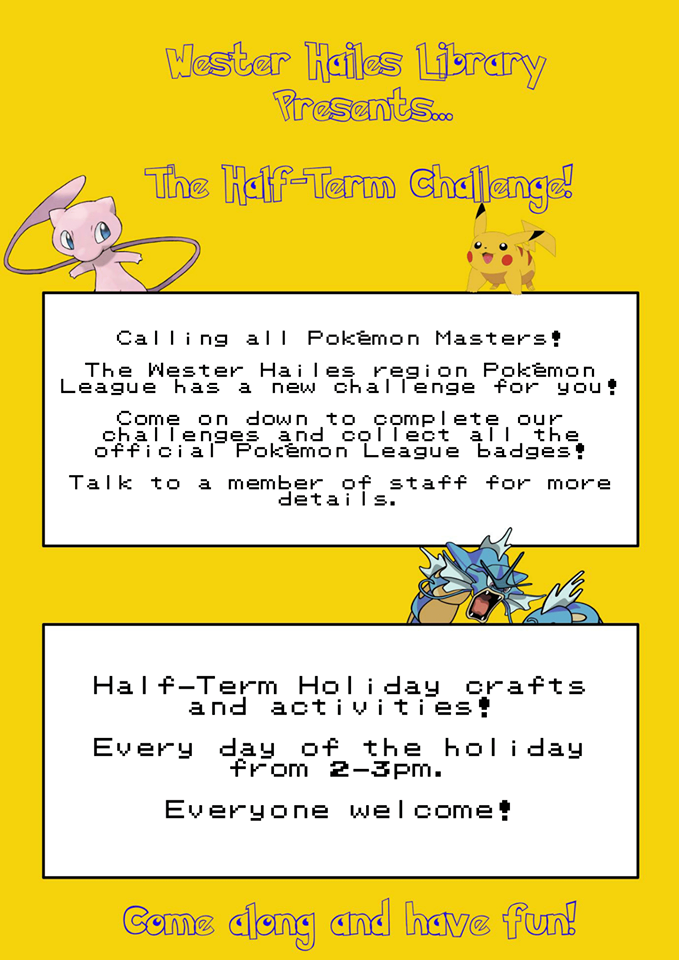 Wester Hailes Library is running a Pokemon Challenge during the school half term holiday. They are inviting Pokemon masters to come down to the library and take part in a series of challenges to collect official Pokemon league badges.