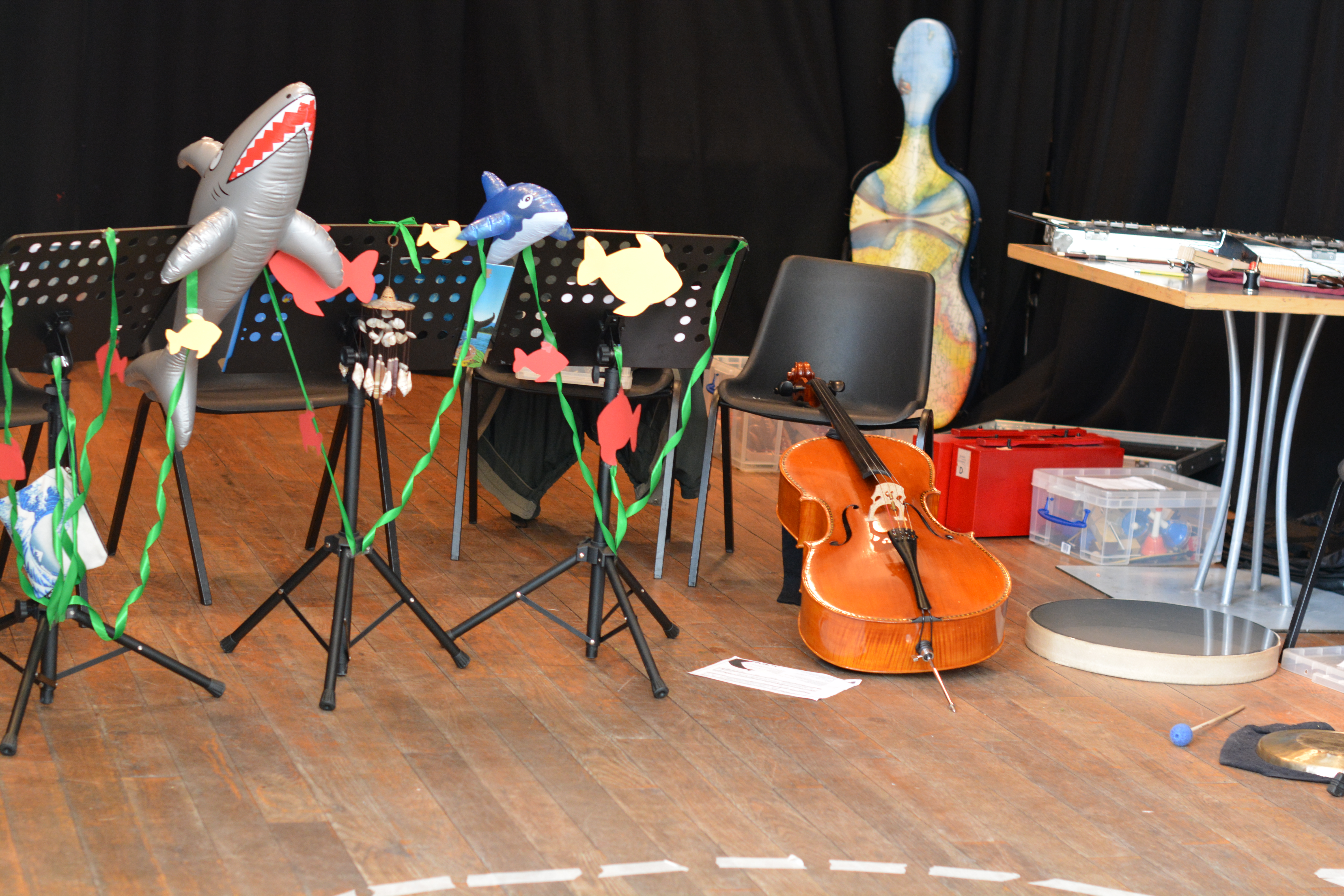 The children and parents all really got involved very enthusiastically during this and I found myself singing along at times too. The musicians certainly had the crowd involved and were constantly moving among them and encouraging them all to try out various types of instruments and to work together as small groups to create the story as it went along. Culminating in creating the shape of the whale on the stage floor using the instruments they had used.