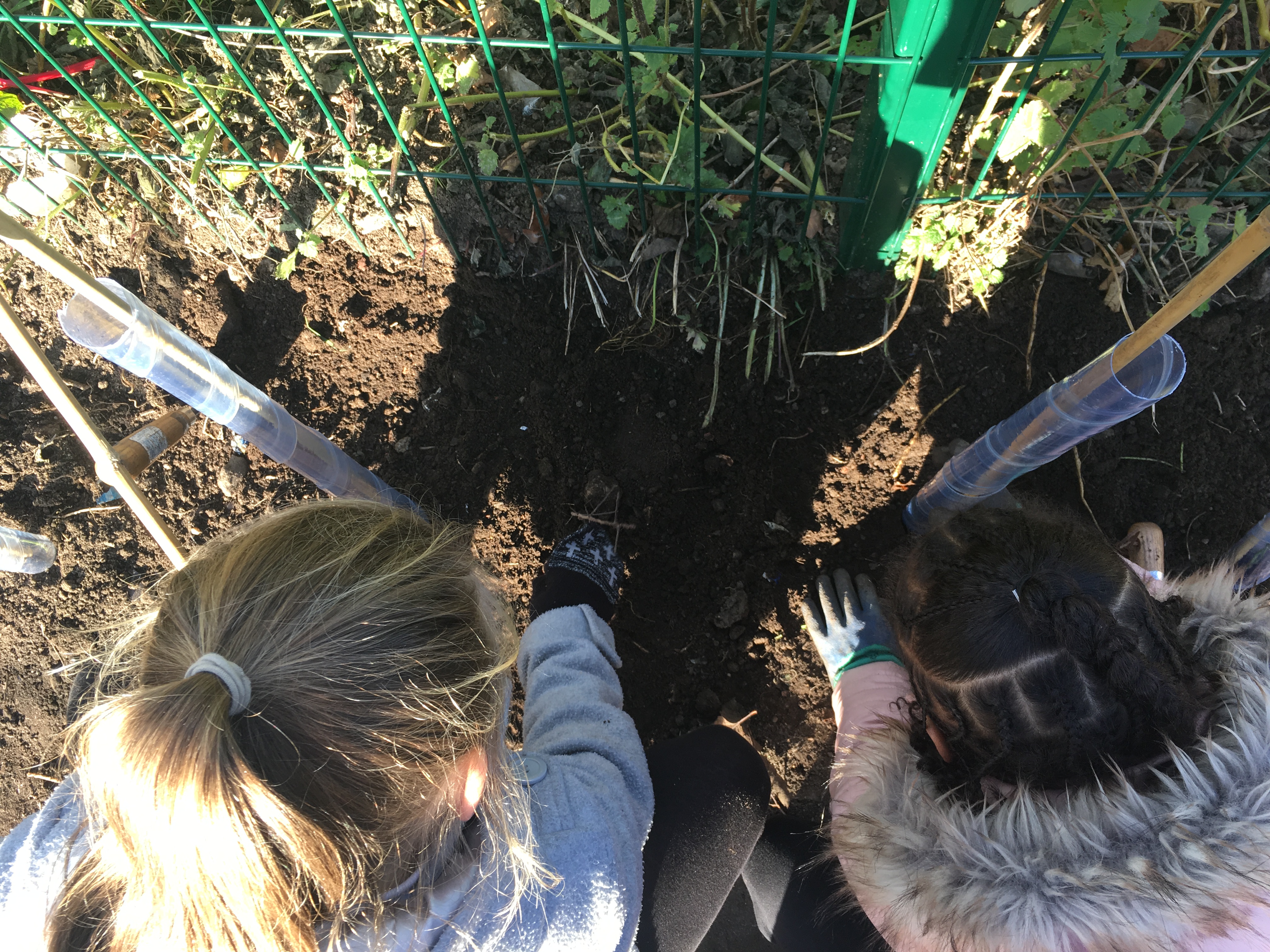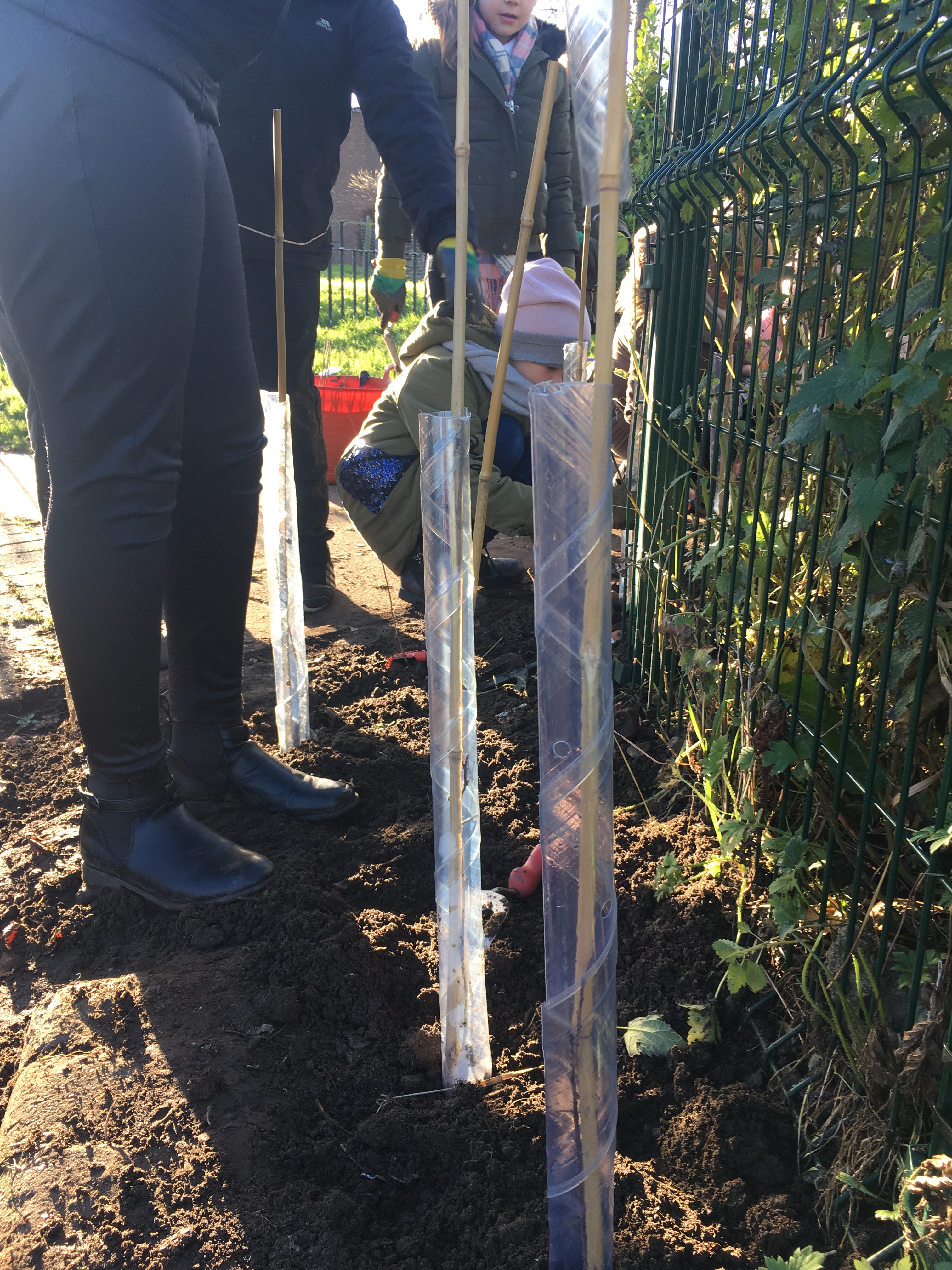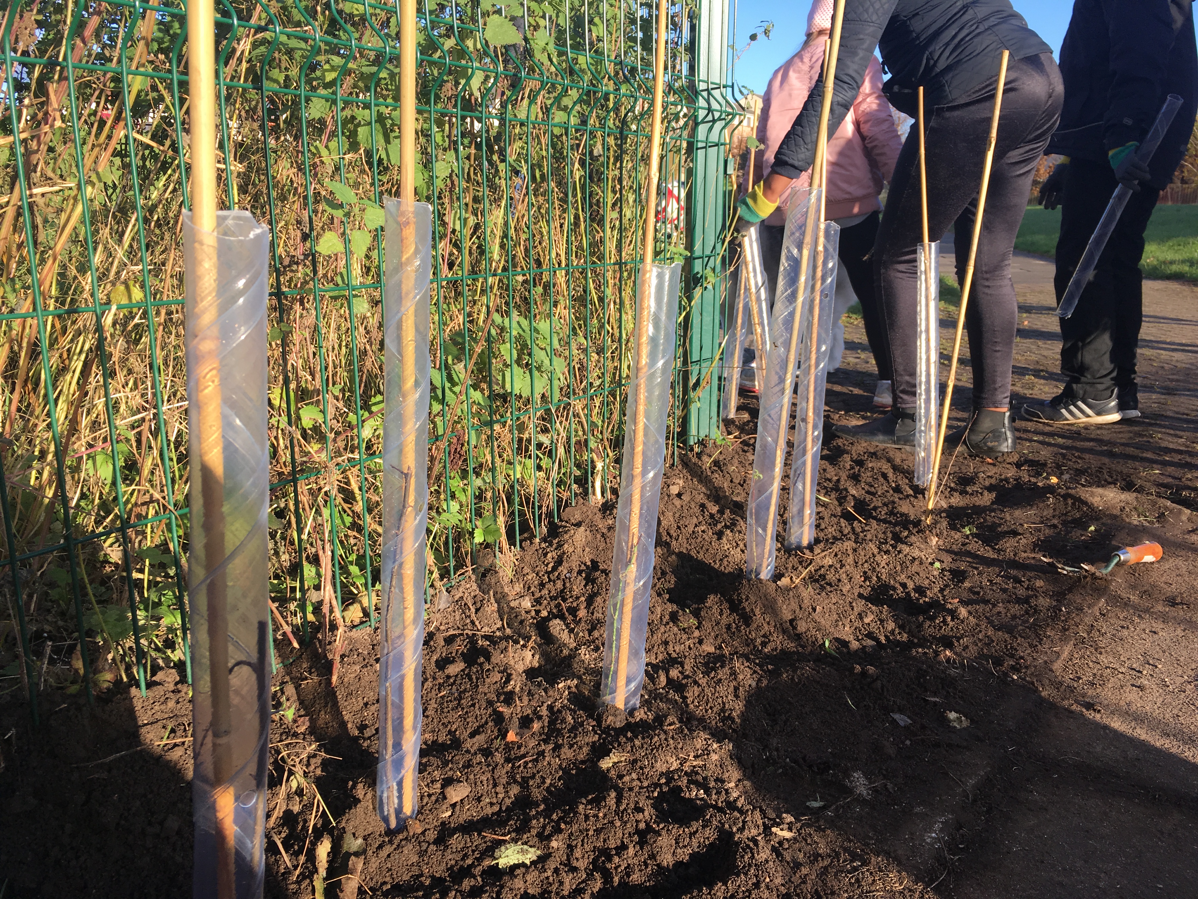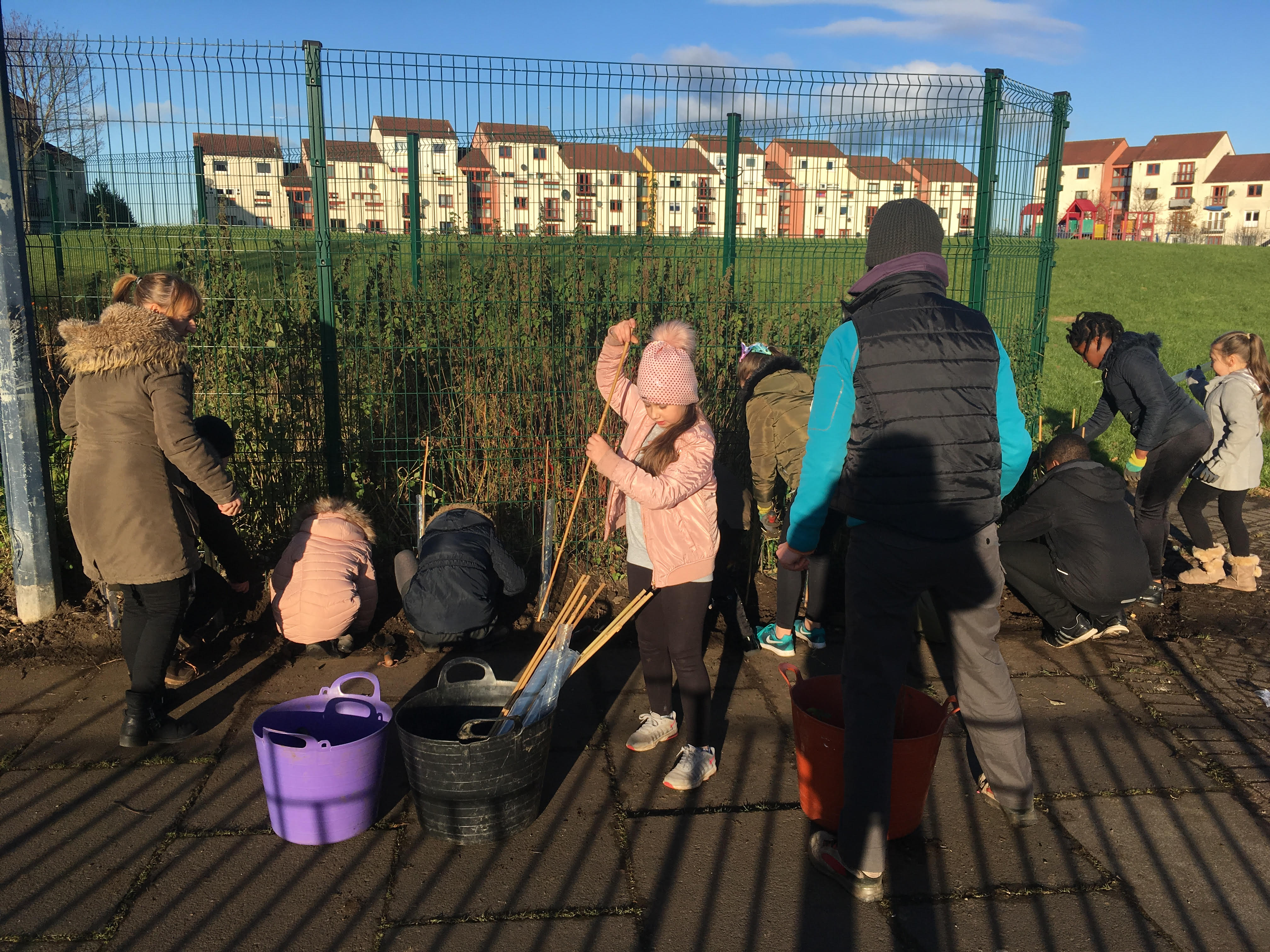 Edible Estates and WHALE Arts Creative Placemaker have been busy the past couple of weeks working with the community to plant a hedgerow of trees around the Clovenstone Community Garden.Clovenstone Community Centre after school clubs, Clovenstone Primary school and Access to Industry have all got involved to help plant the trees. The school formed the self titled “Magical Tree Squad”, a special lunch club of Primary 5 and 6 pupils who have now become tree planting experts and have taken great care in helping look after the trees.