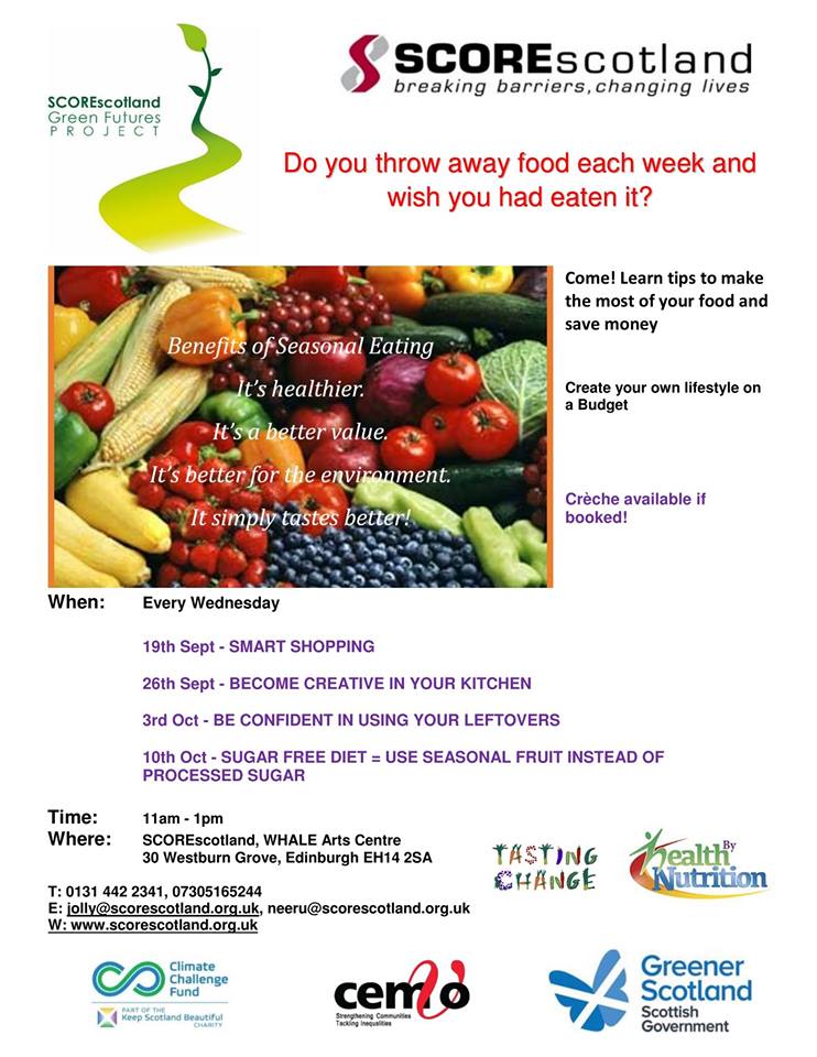 SCOREscotland’s Green Futures Project and Tasting Change will be running a series of Eat Well Workshops from Wednesday 19 September 2018, 11.00am – 1.00pm at the WHALE Arts Centre.