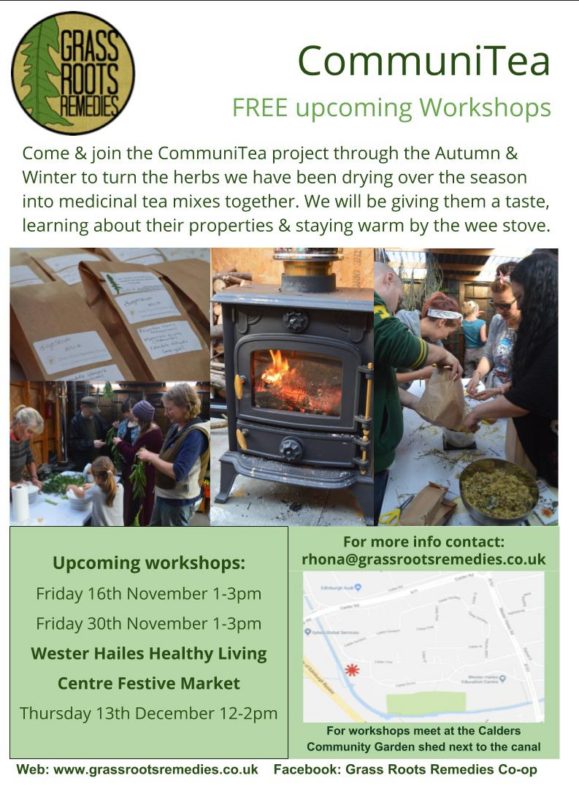 Grass Roots Remedies, CommuniTea project have released information on their upcoming Autumn and Winter workshops where they will be tuning the herbs they have been drying over the season into medicinal teas.