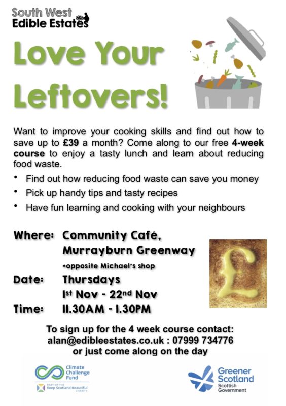 Love Your Leftovers with South West Edible Estates at the Community Cafe on Murrayburn greenway, Thursdays 1 November – 22 November 2018, 11.30am – 1.30pm.