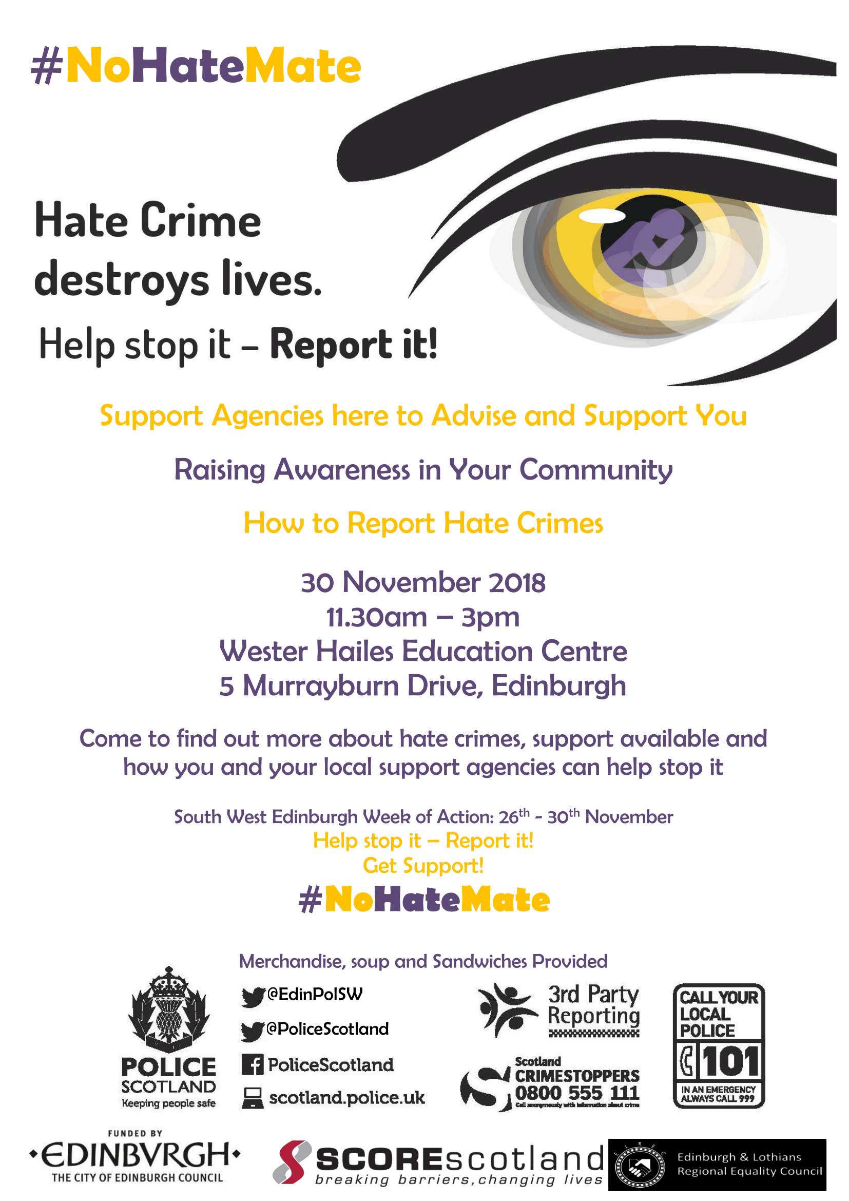 Hate Crime Awareness Week in South West Edinburgh Police Scotland are teaming with SCOREscotland, the City of Edinburgh Council and the Edinburgh and Lothians Regional Equality Council...