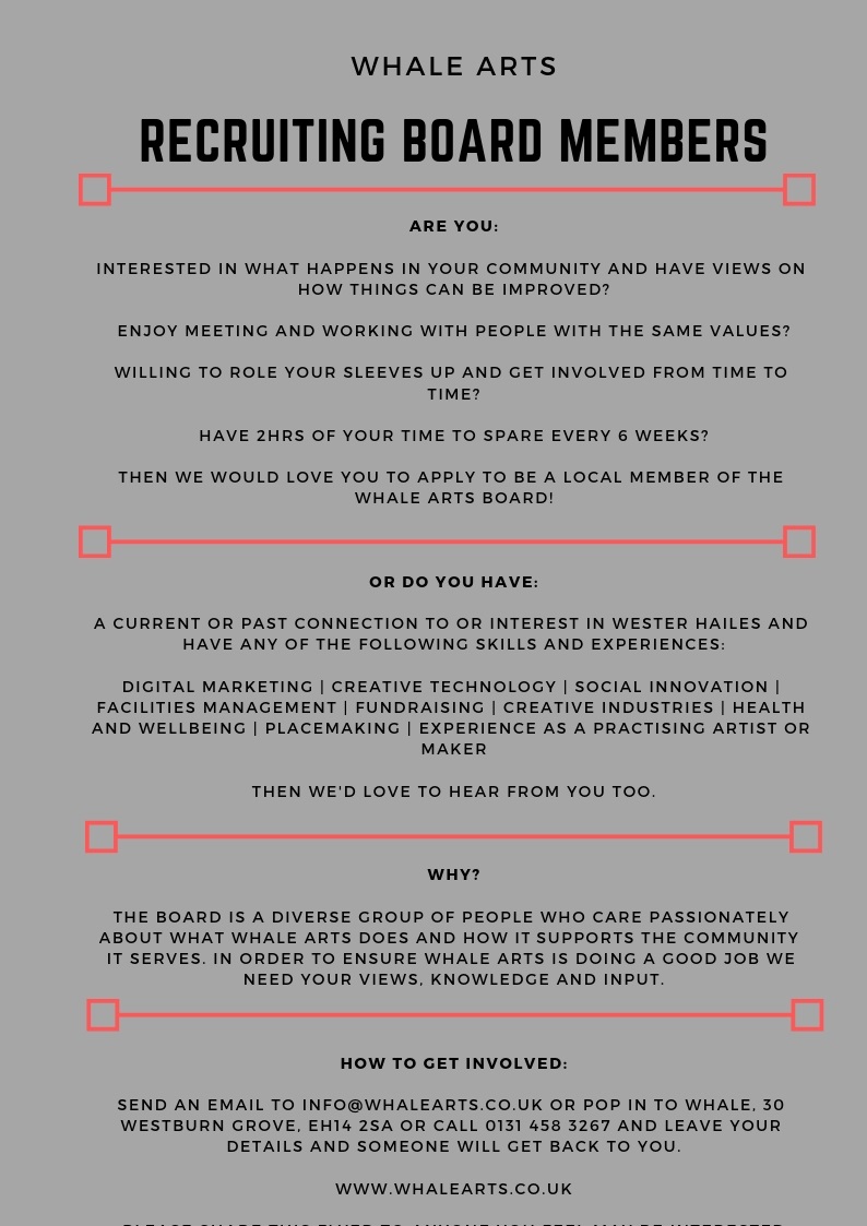 For more information contact WHALE Arts on info@whalearts.co.uk, 0131 458 3267 or pop in to WHALE and let them know.