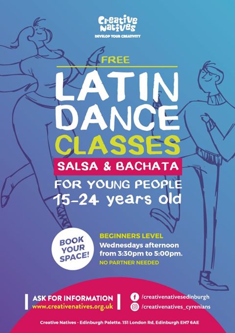 The free Salsa and Bachata dance classes for beginners are for young people aged 15 – 24 on Wednesdays from 3:30pm to 5:00pm, Basement 1 Room 10, St. Margaret’s House, Eh7 6AE. No partner is needed.