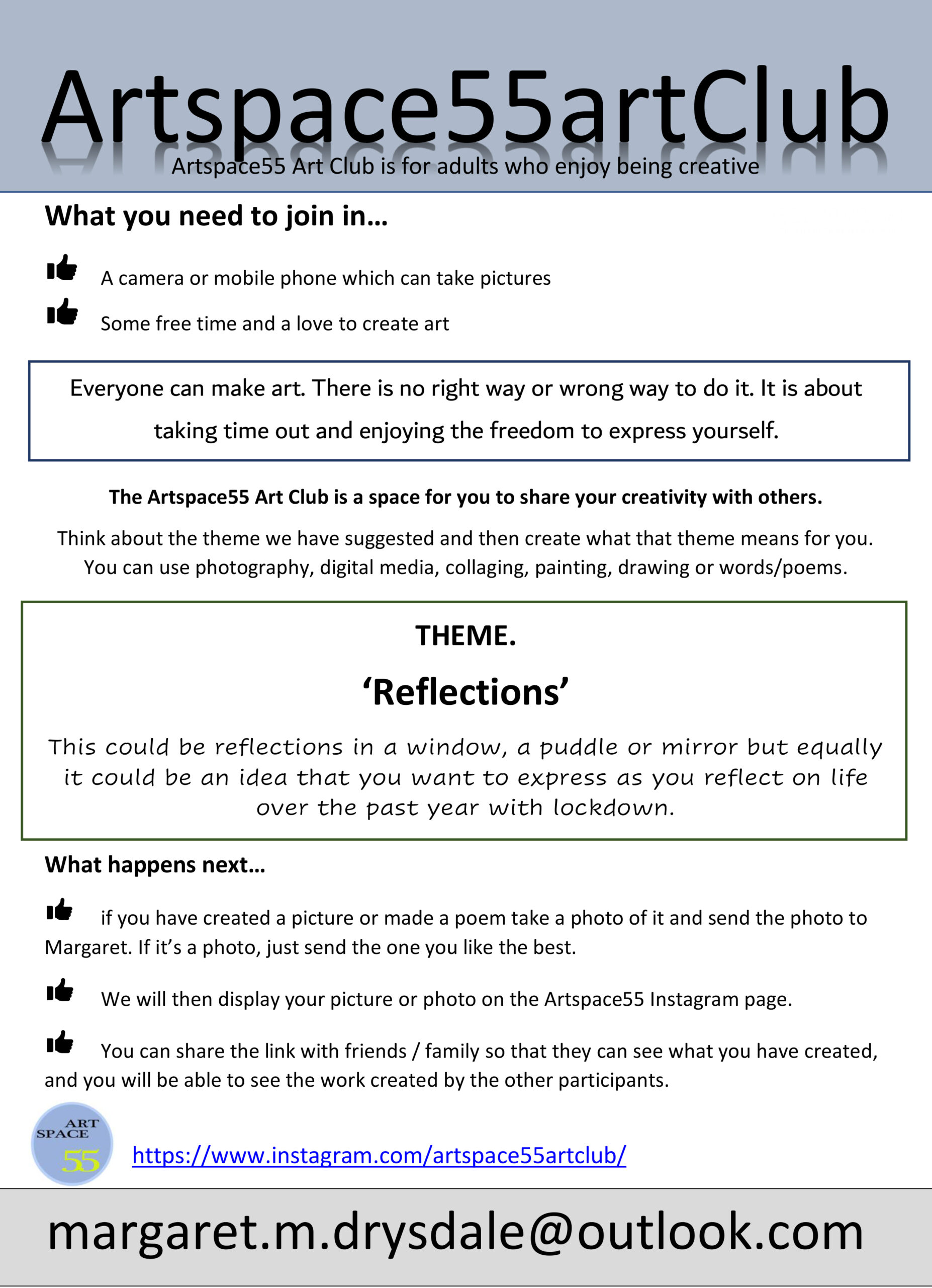 Artspace55 Art Club Artspace55 an Art Club for adults has announced that their next theme with be ‘Reflections’. This could be reflections...