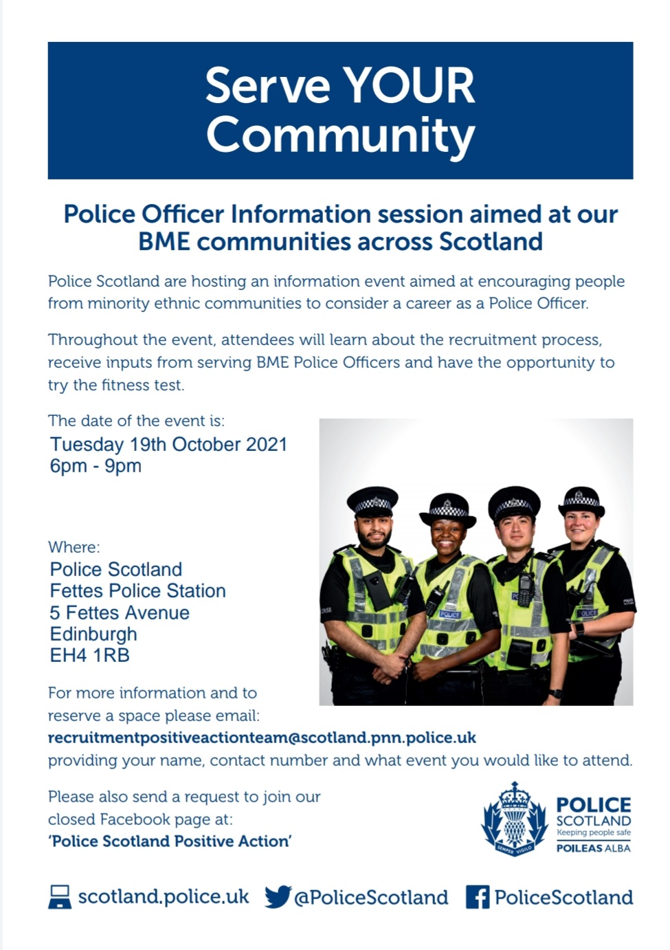 Police Scotland BAME Recruitment Event Police Scotland will be hosting a live recruitment event aimed at people from all minority ethnic communities across Scotland....