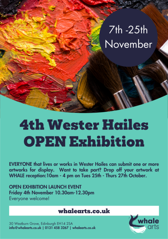 The artwork can be dropped of at reception between 9.00am and 5.00pm. The Wester Hailes Open is an annual exhibition of artwork at WHALE Arts of works created by those that live or work in Wester Hailes. The exhibition has now been going for four years, even going digital during the pandemic.