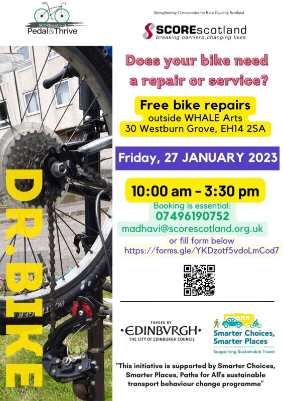 SCOREscotland will be holding a Doctor Bike session outside WHALE Arts, on Friday 27 January 2023, 10.00am – 3.30pm.