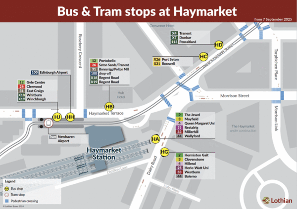 Haymarket (West Maitland Street): Lothian services 3, 4, 25, 26, 31, 33, 44 passing West Maitland Street will no longer stop here. Alternative stops will be available at Dalry Road, Haymarket Terrace or Shandwick Place. East Coast Buses, express services and NightBus will continue to stop here.