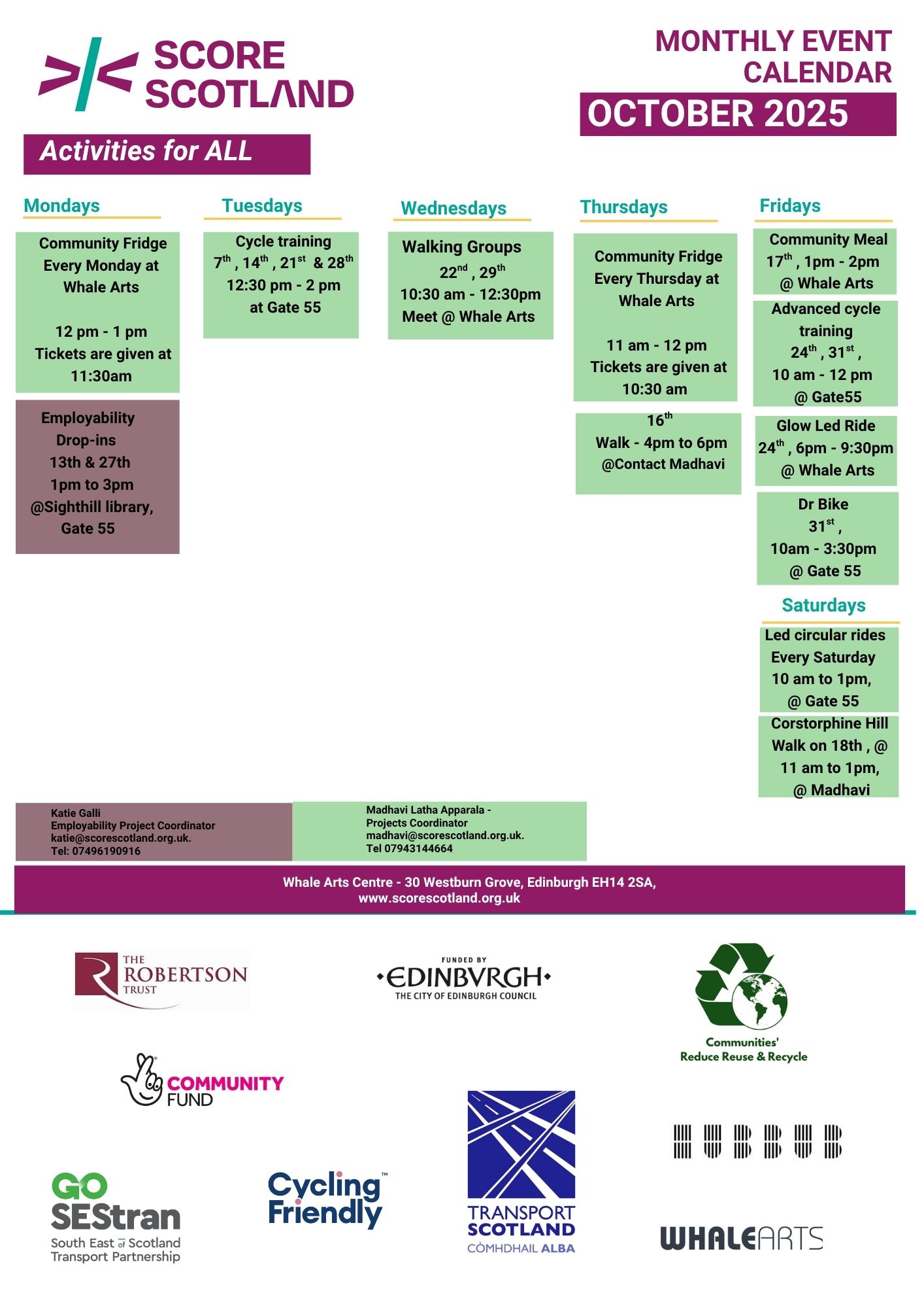 You can read an embedded version of the timetables below, for more information contact SCOREscotland on 0131 442 2341.