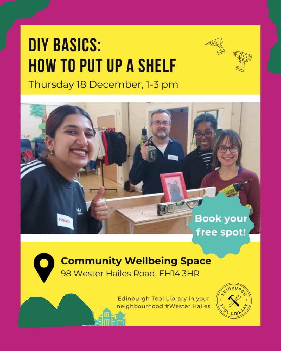 Edinburgh Tool Library will be holding a hands-on beginner DIY workshop at the Community Wellbeing Space on Thursday 18 December 2025, 1.00pm – 3.00pm.