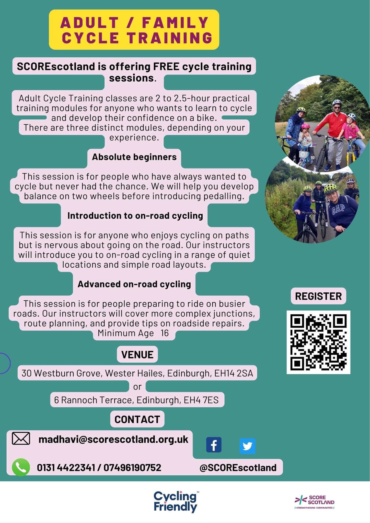 SCOREscotland are holding free cycle training sessions for adults and families perfect for those who are new to cycling or getting back on the bike after years.