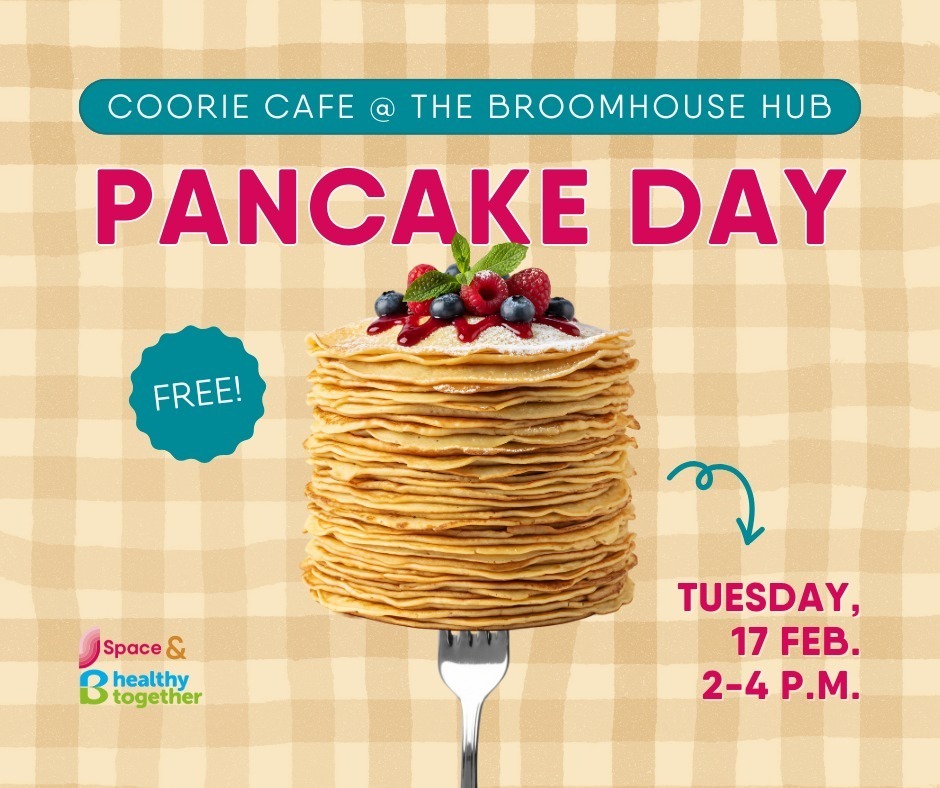 Space at The Broomhouse Hub and B Healthy Together invite you to celebrate Pancake Day with them on Tuesday, 17 February 2026 from 2.00pm – 4.00pm.