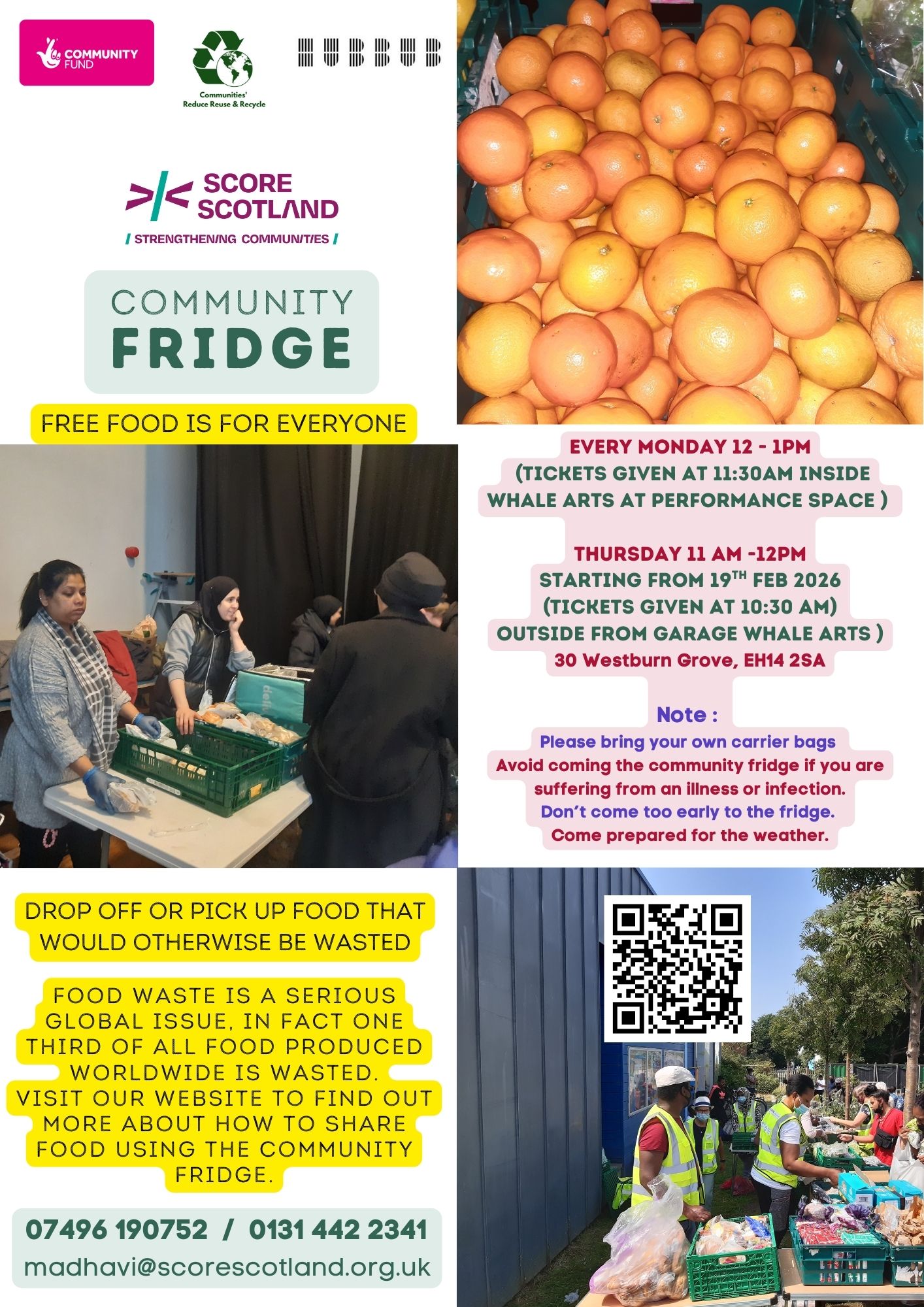 SCOREscotland run a weekly community fridge distributing donated food from local supermarkets to help reduce food waste and help people through the current hard times.